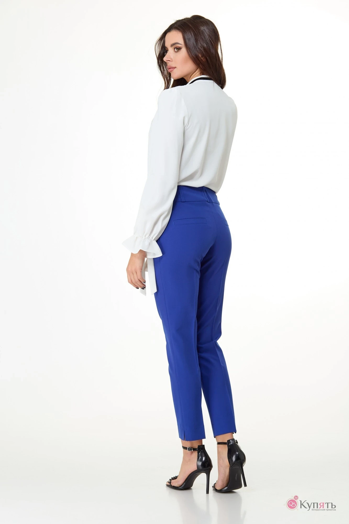 При съемке брюк малаиновых тонов в образе использована блуза AnelliStyle – 303 тонов «Нюд». Для съемки в васильковых тонах – 828 блуза молочных оттенков, а так же жилет 1036 так же васильковых оттенков.