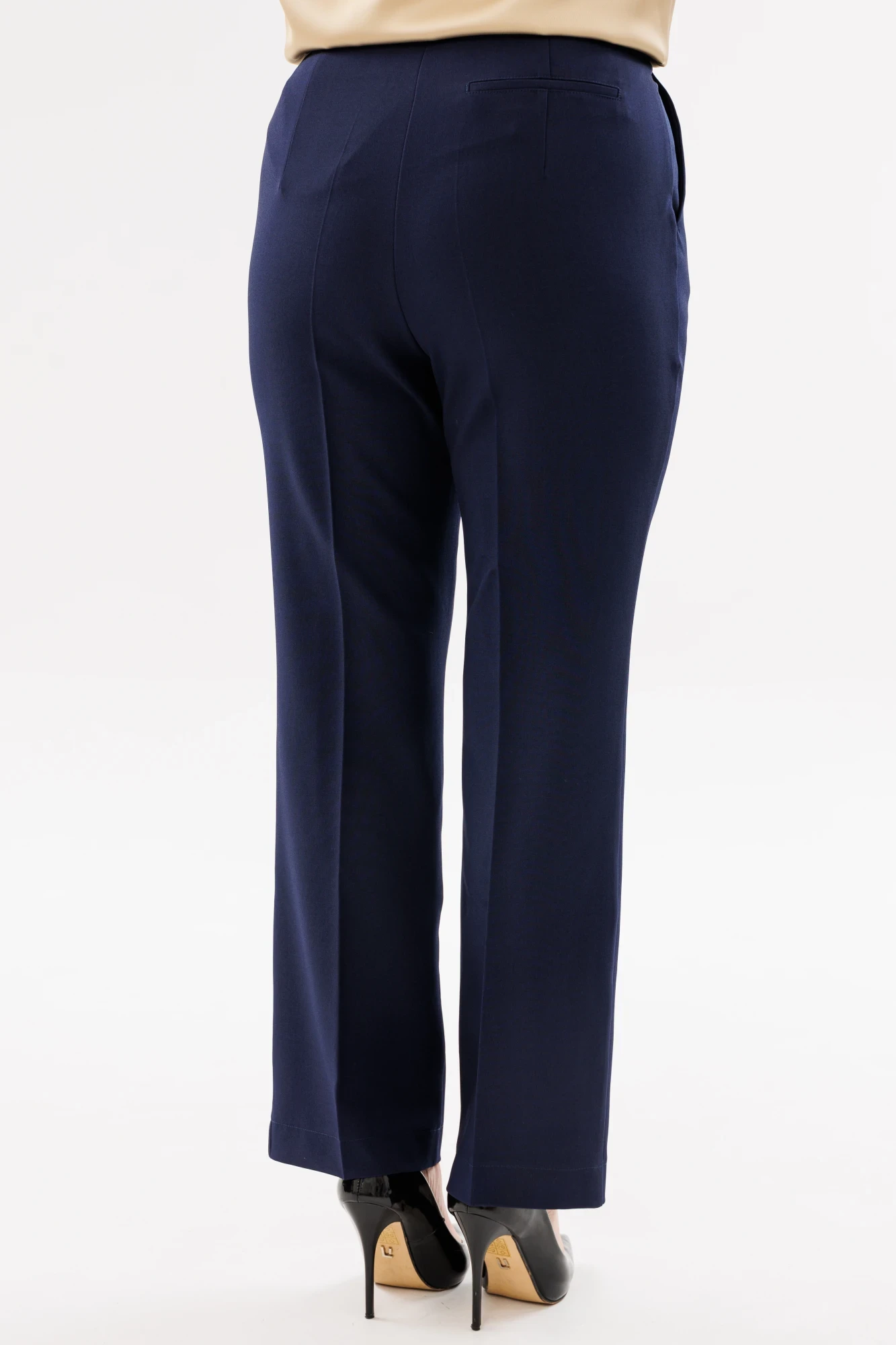 Брюки умеренного объема, прямого силуэта, с заутюженными стрелками. На задних половинках талиевые вытачки. На правой задней половинке декоративный карман с листочкой. На передних половинках, на уровне талии, заложены складки, направленные в сторону боковых швов. На передних половинках брюк функциональные карманы с отрезным бочком. Пояс отрезной, притачной. На поясе шлевки. Пояс расположен на уровне линии талии. Застежка брюк – классический гульфик. Застежка пояса – пуговица. Длина брюк 107 см.