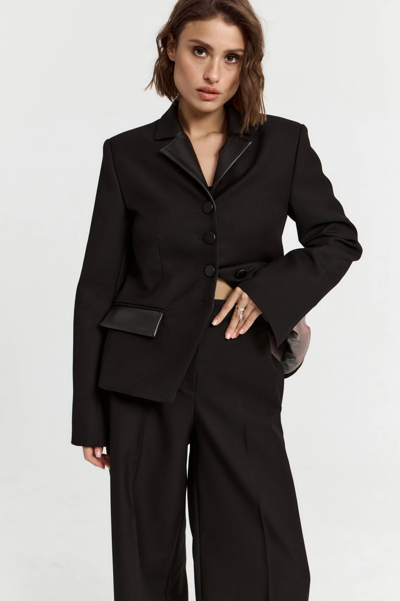 Брюки прямого свободного кроя выполнены из костюмной ткани. Пояс стабильный. Брюки приталенные, расширенные к низу.