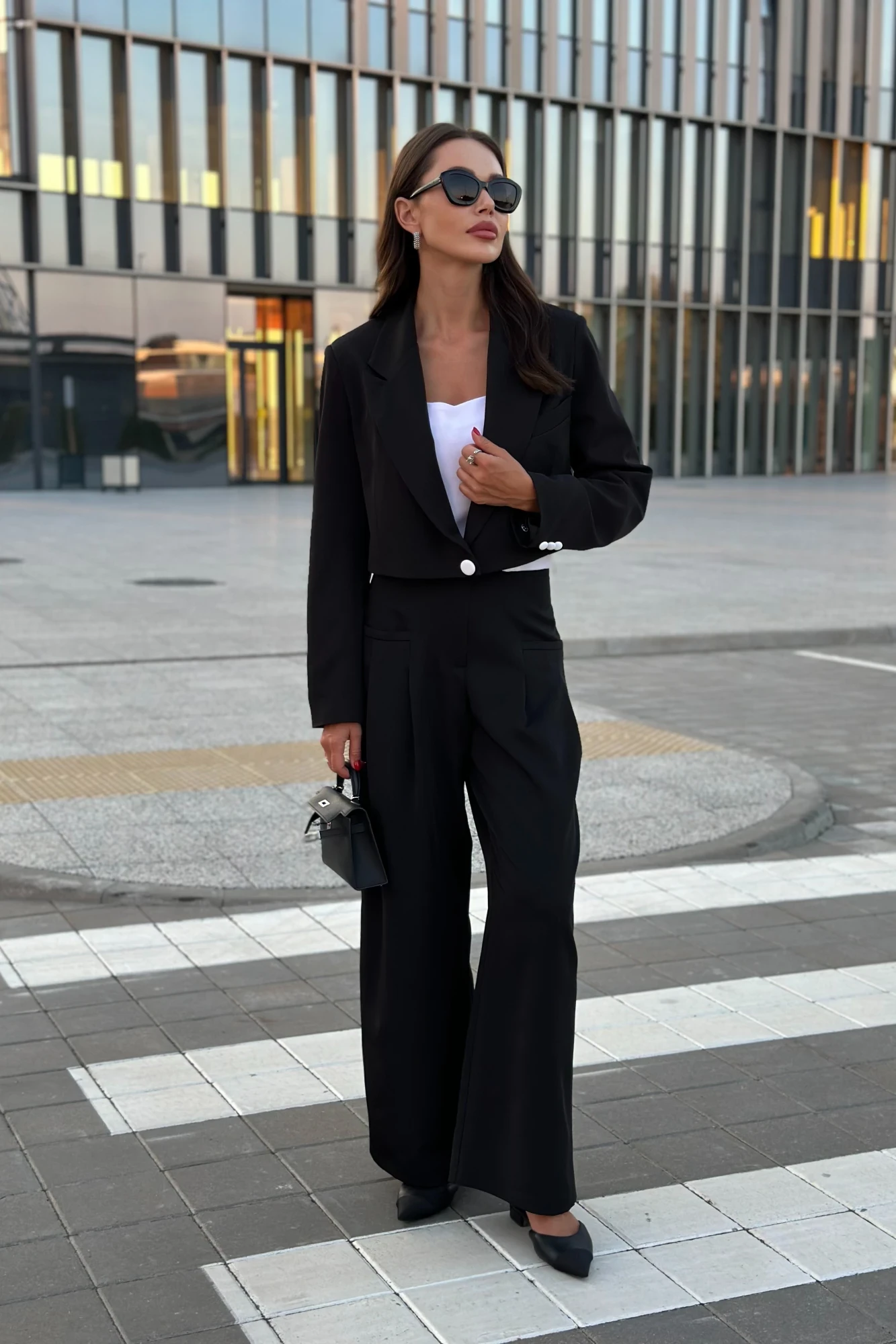 Брюки широкие свободного силуэта. По передним половинкам обработаны глубокие прорезные карманы. Также обработаны складки по передним половинкам. Задние половинки также обработаны прорезными карманами. Застёжка -молния и пуговица. Пояс притачной. Для ремня пришиты шлёвки по поясу изделия.