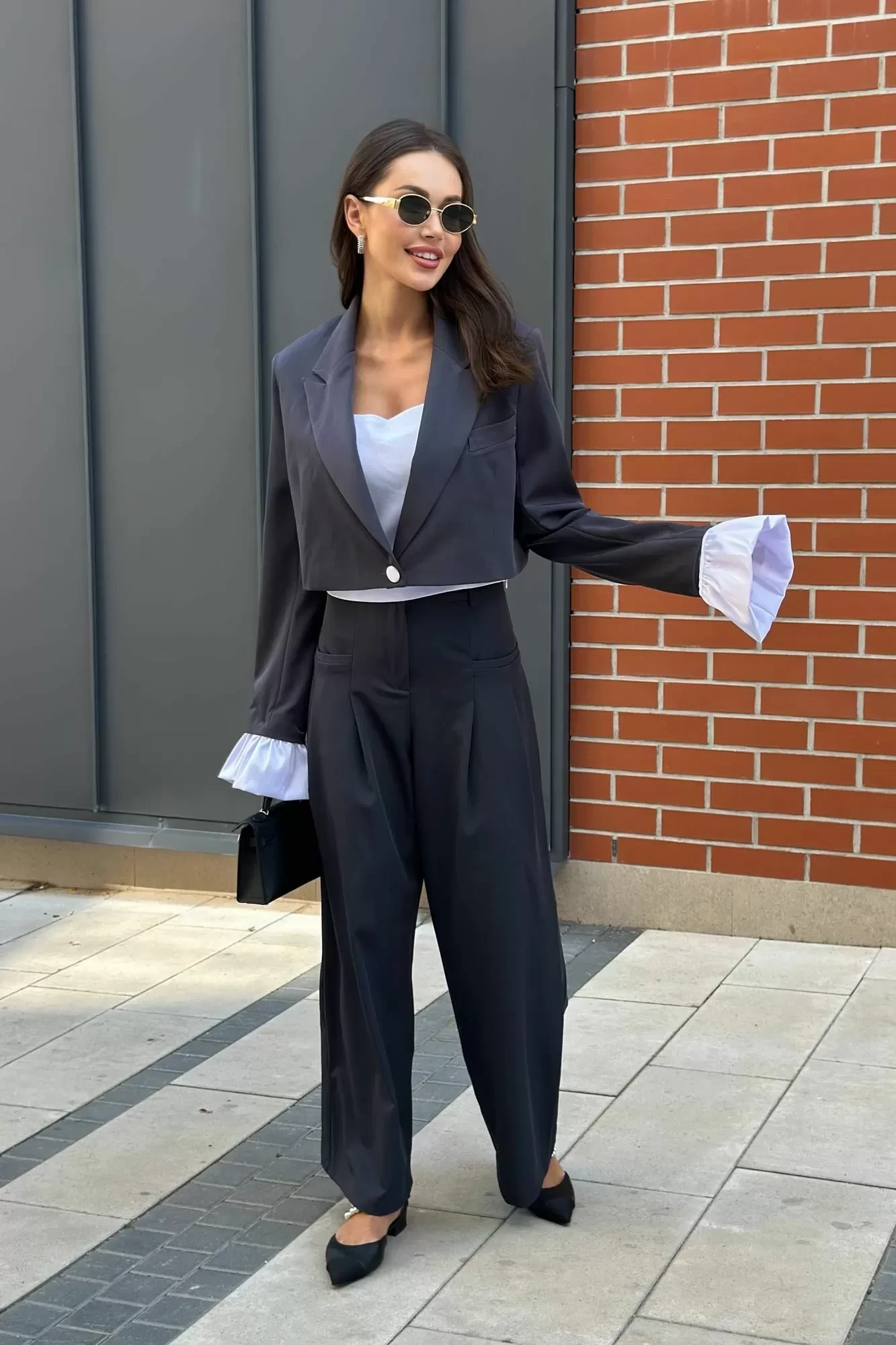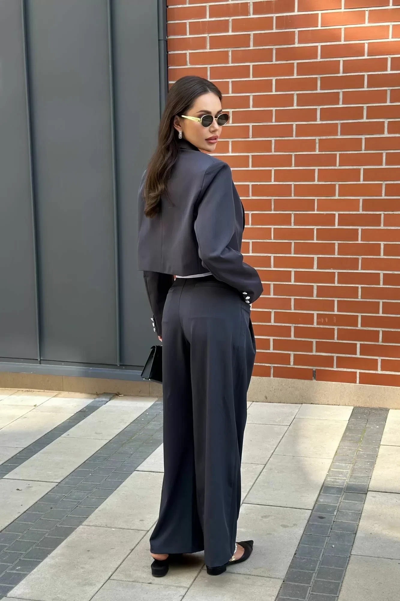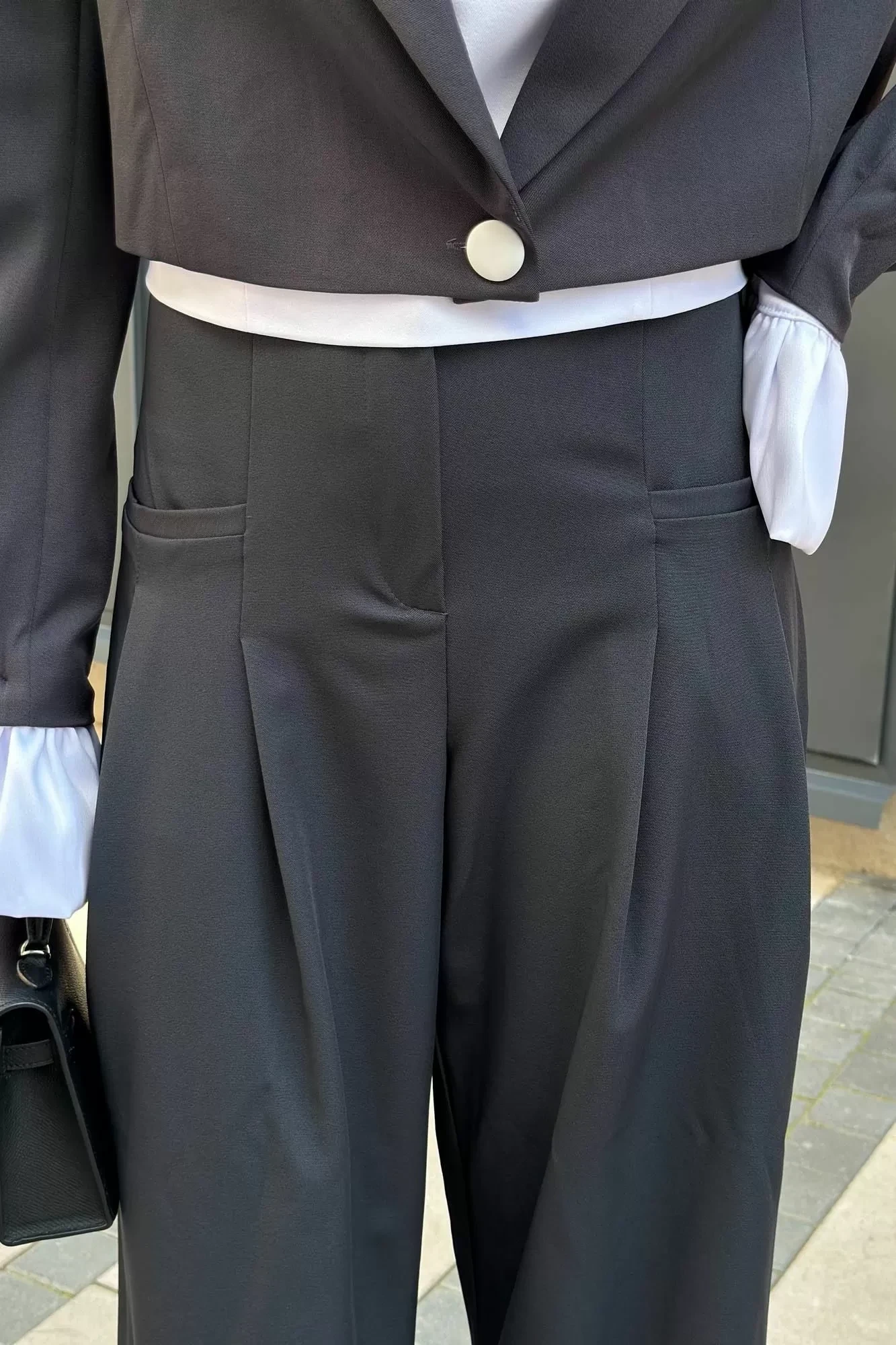 Брюки свободного кроя, по передним и задним половинкам обработаны прорезные карманы, вертикальные защипы по переду переходящие в складки зрительно вытягивают силуэт.
