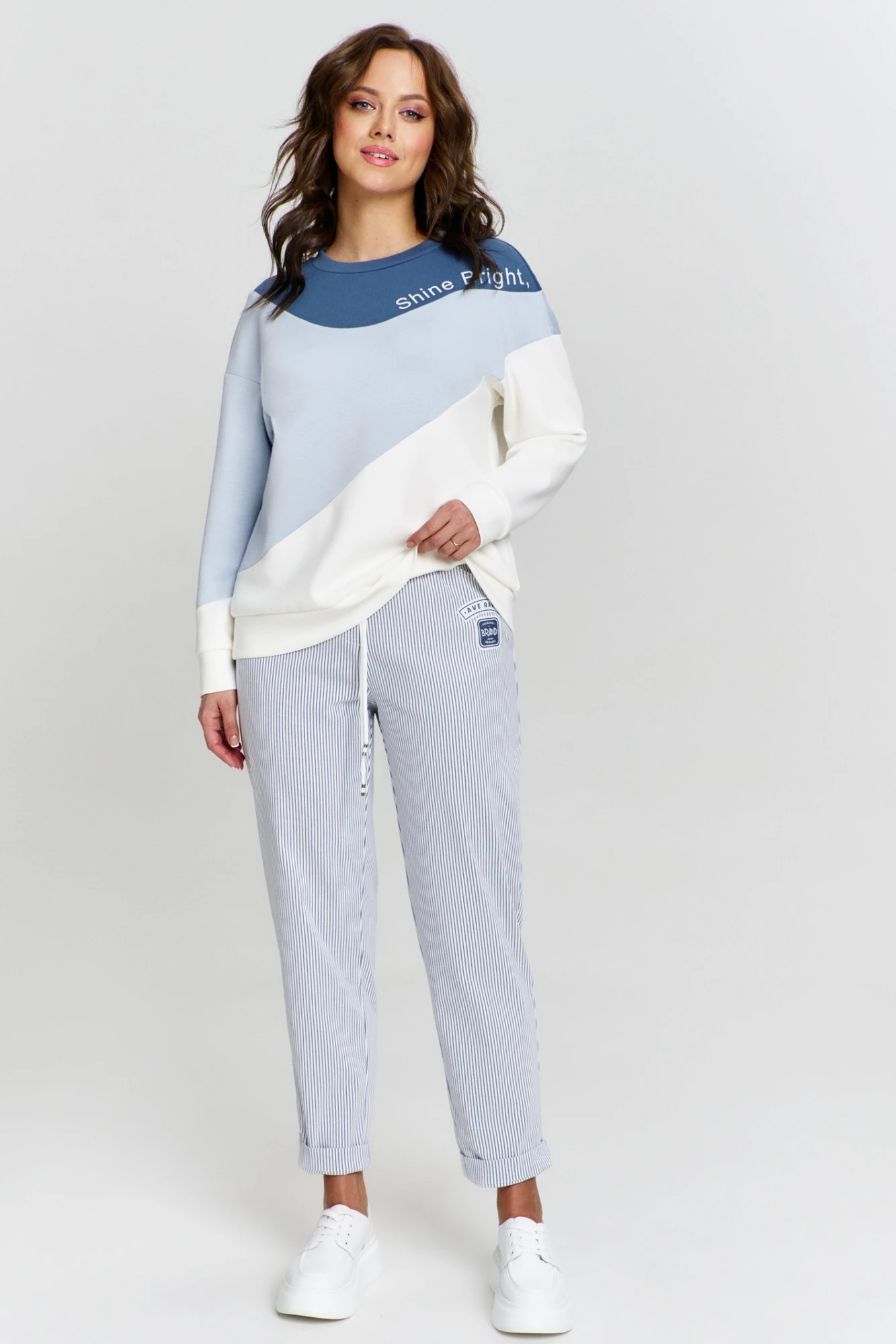 Супер комфортные брюки из стрейчевого хлопкового материала в полоску, с четырьмя функциональными карманамии, трикотажным поясом на резинке. Изделие декорировано авторскими нашивками.