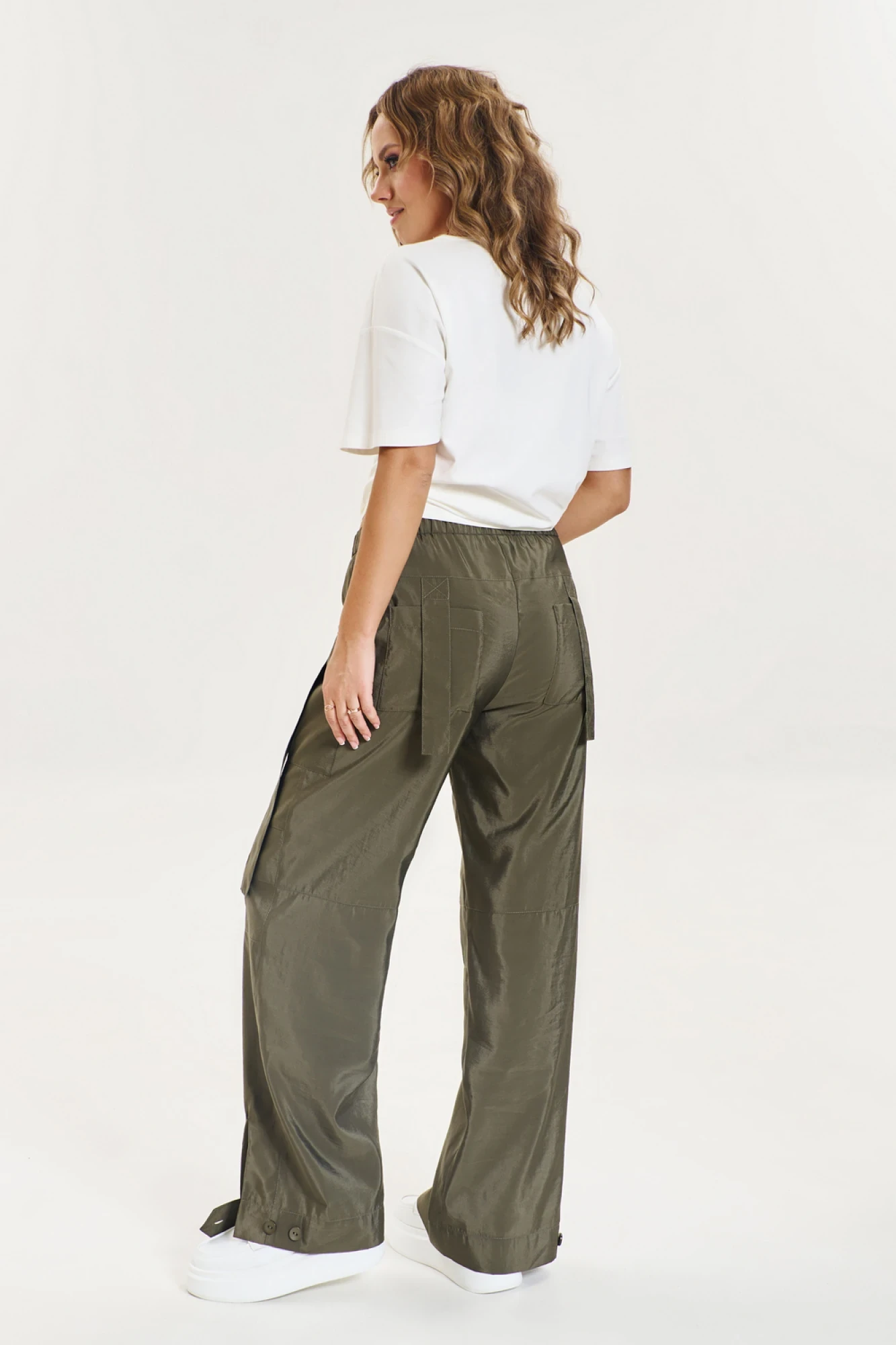 Брюки из вискозной струящейся ткани, прмого силуэта, с объемными накладными карманами с клаапанами и декоративными патами. На уровне колена вставка с вытачками. Пояс с резинкой. По низу брюк - разрезы с застежкой на пуговицы, с помощью которых можно регулировать ширину брюк.