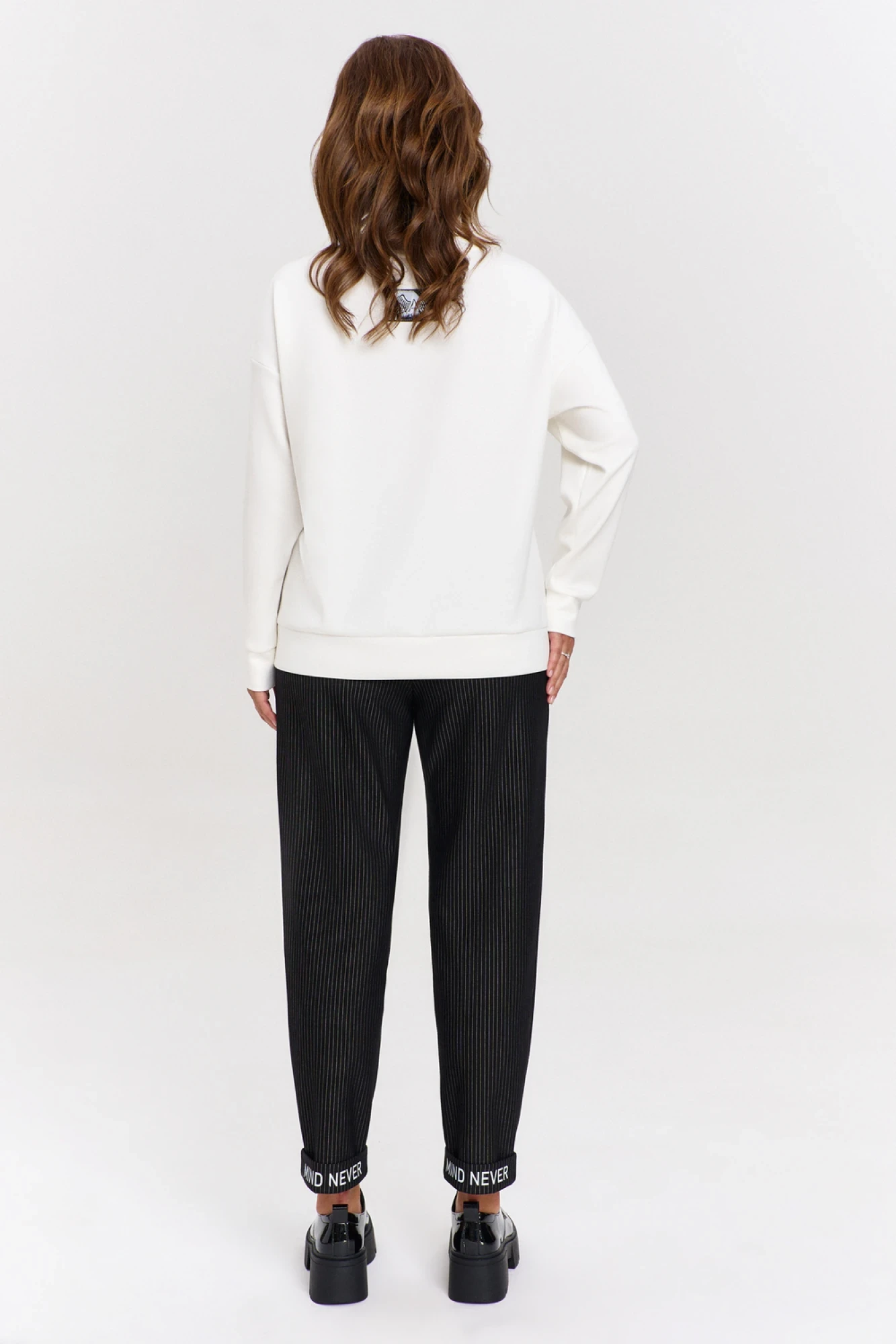 Брюки из плотного трикотажа в полоску, зауженные к низу, с боковыми карманами. Пояс - декоративная резинка со шрифтовым принтом. На отворотах низа брюк так же шрифтовой принт.