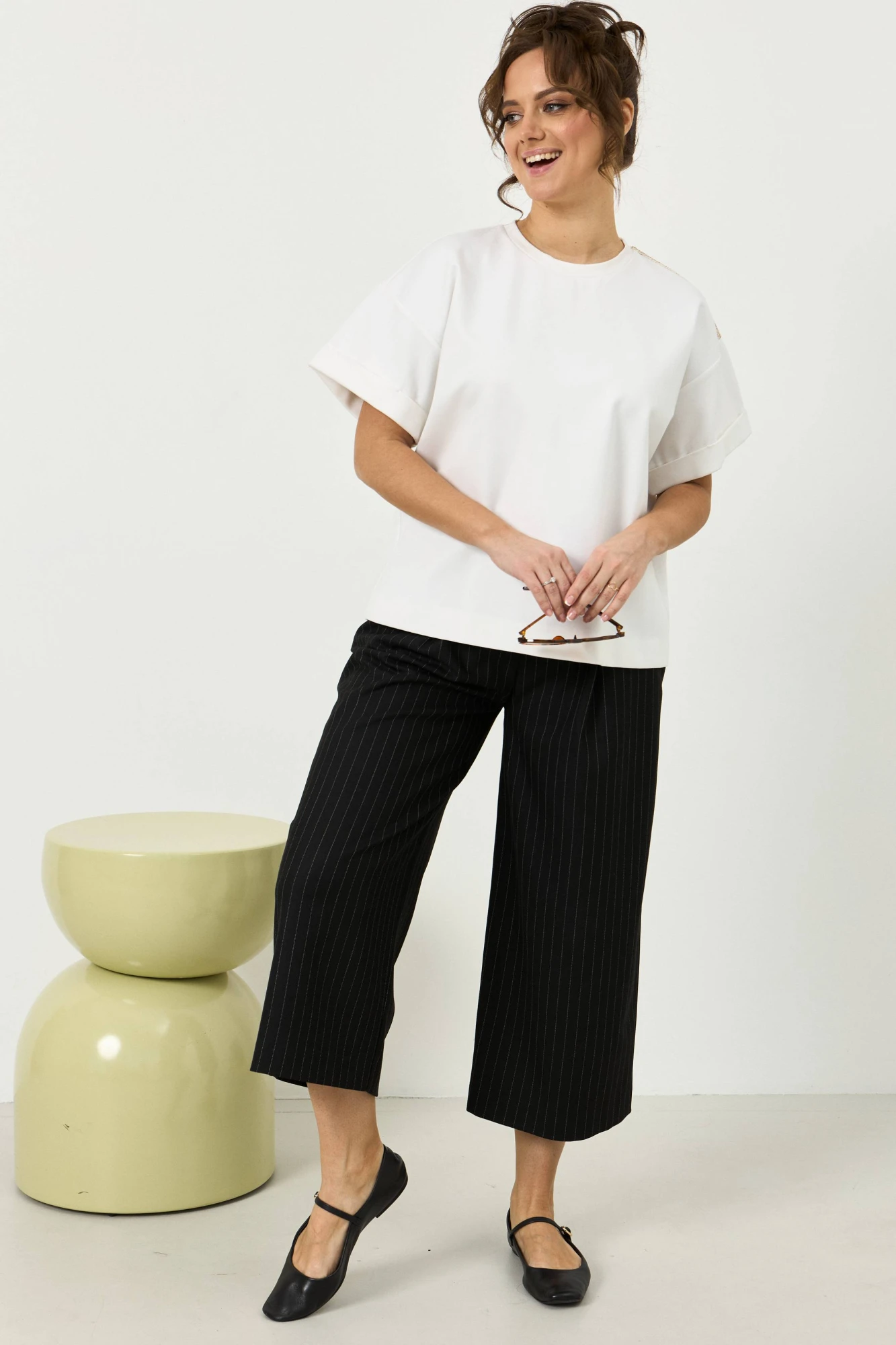 Брюки-кюлоты, прямые, на стабильном поясе, по бокам пояса на резинке. По бокам функциональные карманы. Застежка на молнию и пуговицу. Брюки из костюмной ткани в полоску.