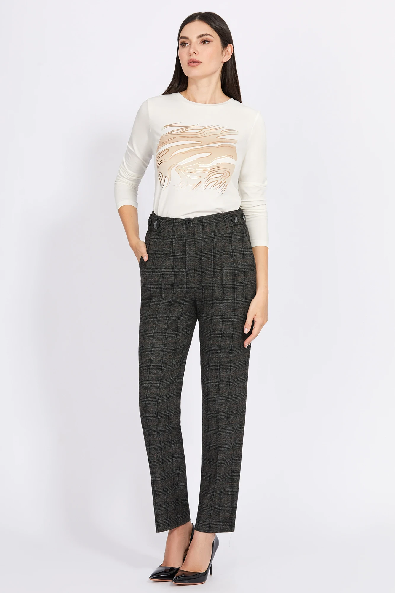 Элегантные брюки со стрелками- вытягивают фигуру. Модель на частично притачном поясе, собранном на эластичную тесьму по спинке, выполнена из приятной ткани с добавлением вискозы и ненавязчивым клетчатым рисунком. Акцентом в брюках являются отделочные пояски с отделочными пуговицам. Спереди застёжка на молнию и петлю-пуговицу и функциональные косые карманы. Сзади - два кармана с листочками.