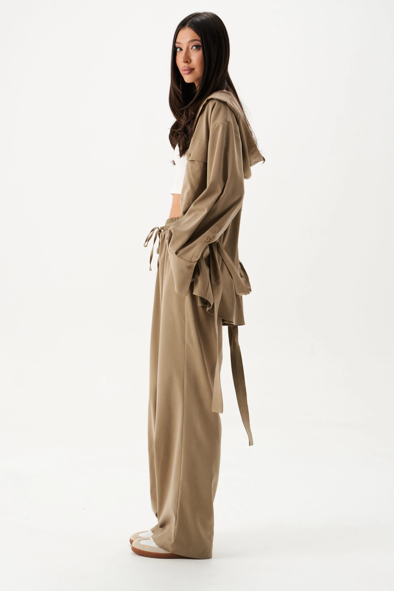 Брюки прямого свободного кроя. Выполнены из мягкой текстильной ткани в цвете хаки. Пояс на резинке с кулиской. В боковых швах прорезные карманы, по задней части изделия накладные карманы. Длина 108 см (с учётом пояса)