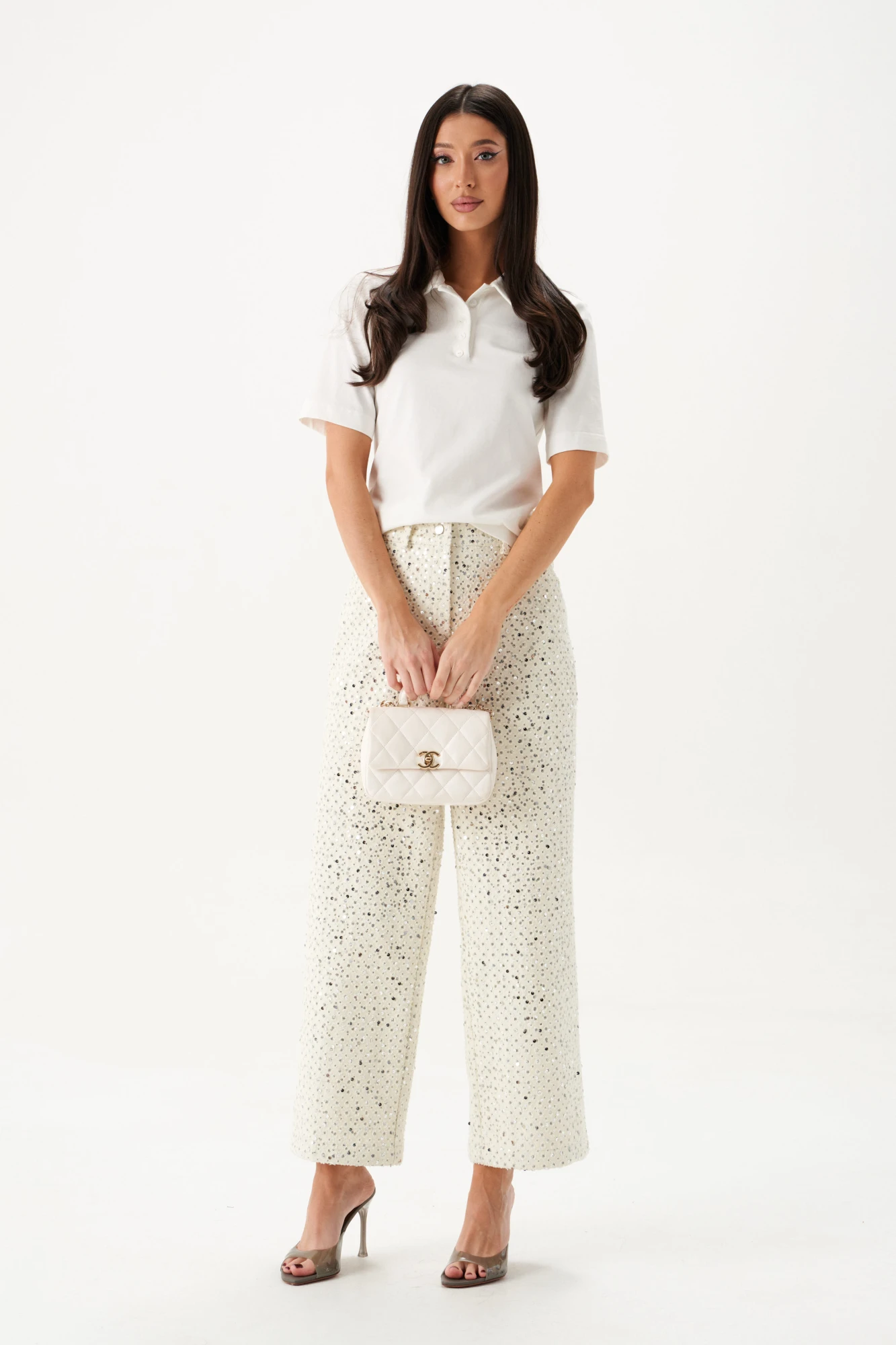 Брюки прямого кроя. Выполнены из джинсовой ткани белого цвета на люрексной основе с перфорацией и пайетками. Пояс стабильный. Застёжка - молния, пуговица. Карманы по переду с фигурным входом, на задней части изделия карманы накладные. Длина брюк 98 см (с учётом пояса)