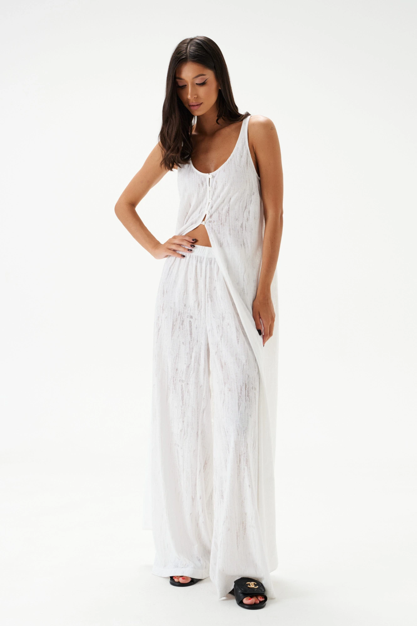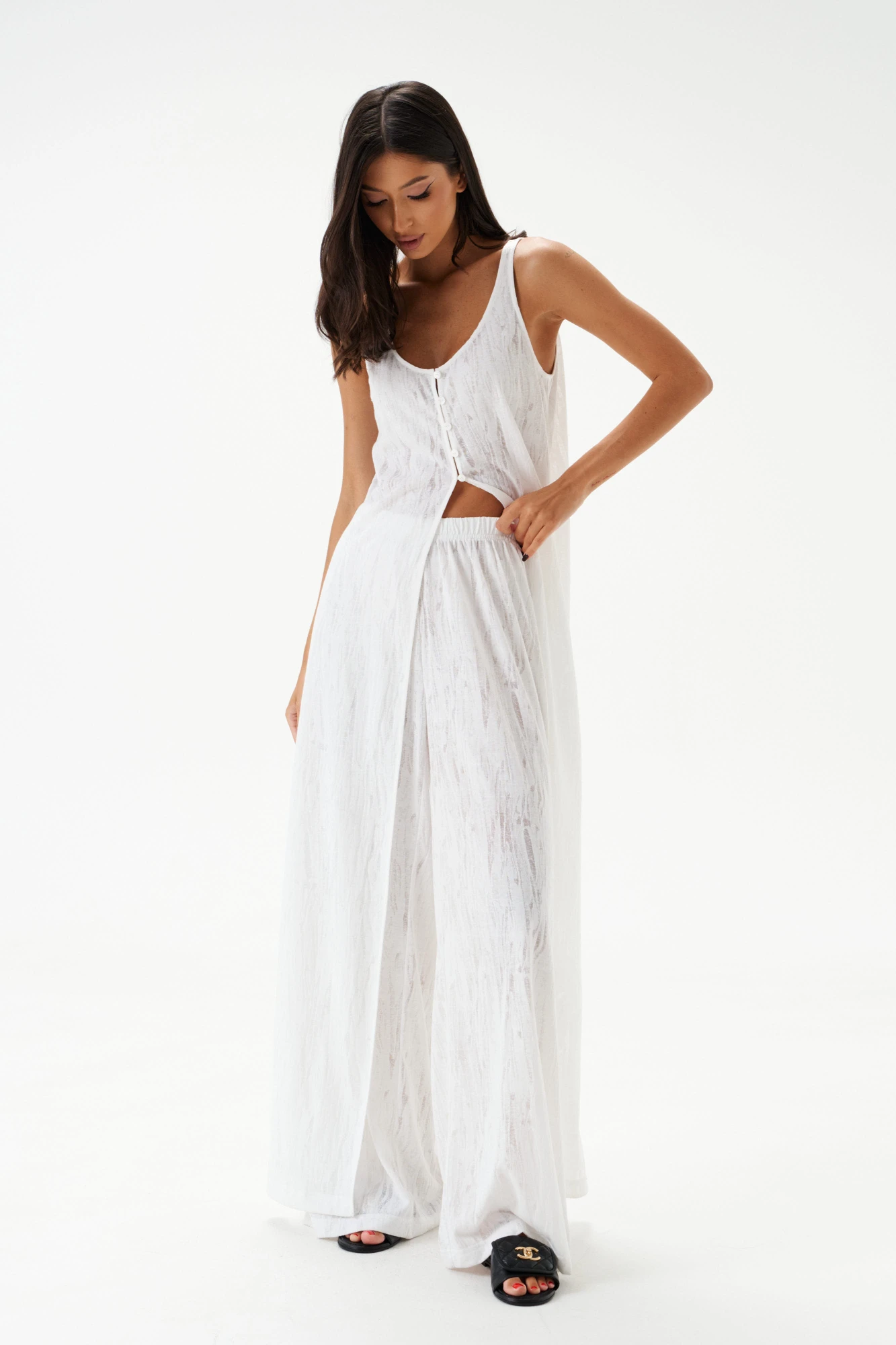 Брюки прямого свободного кроя, выполнены из трикотажной, полупрозрачной, фактурной ткани. Характеристики: прямой крой, пояс на резинке. Длина по боковому шву 108 см
