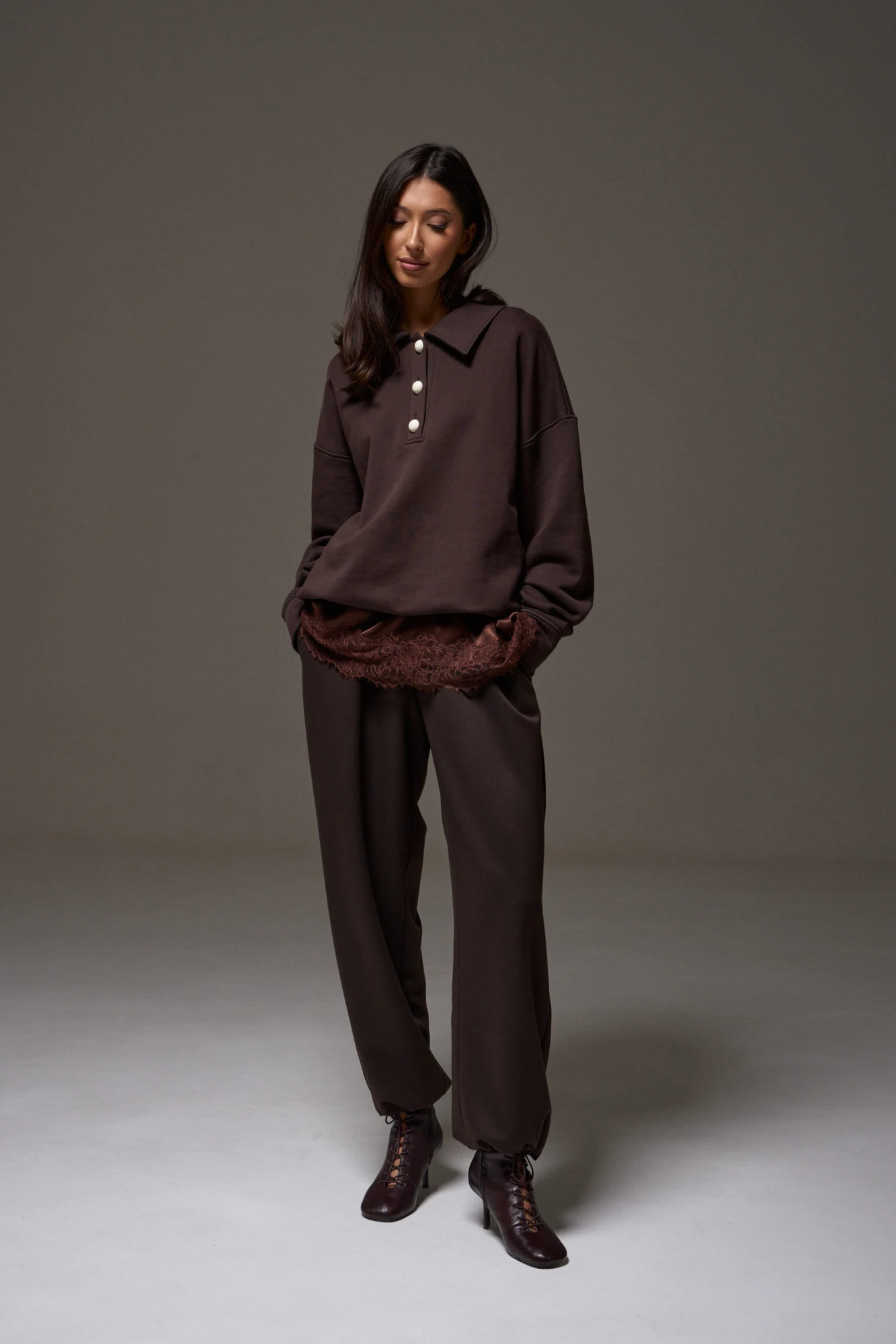 Брюки свободного кроя. Выполнены из плотной текстильной ткани шоколадного цвета. Пояс на резинке. Застёжки нет. В боковых швах карманы. Низ брючины на резинке с фиксатором (регулируется). Длина брюк 100 см