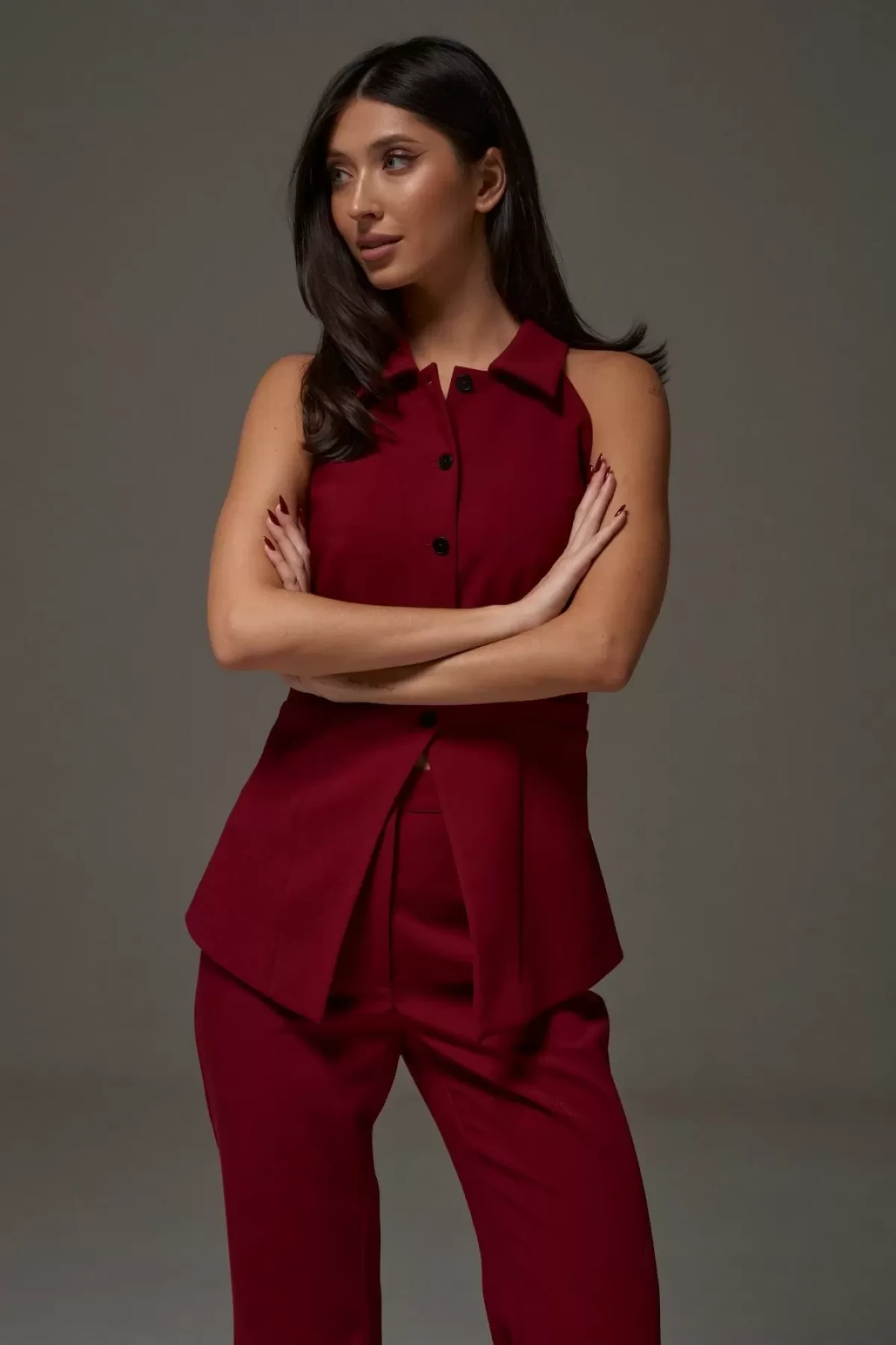 Брюки полуприлегающего силуэта с разведением к низу. Характеристики: полуприлегающий силуэт, пояс стабильный, по переднему и заднему полотну брюк стрелки, по заднему полотну прорезные кармашки «обманки» длинна брюк по боковому шву 112 см.