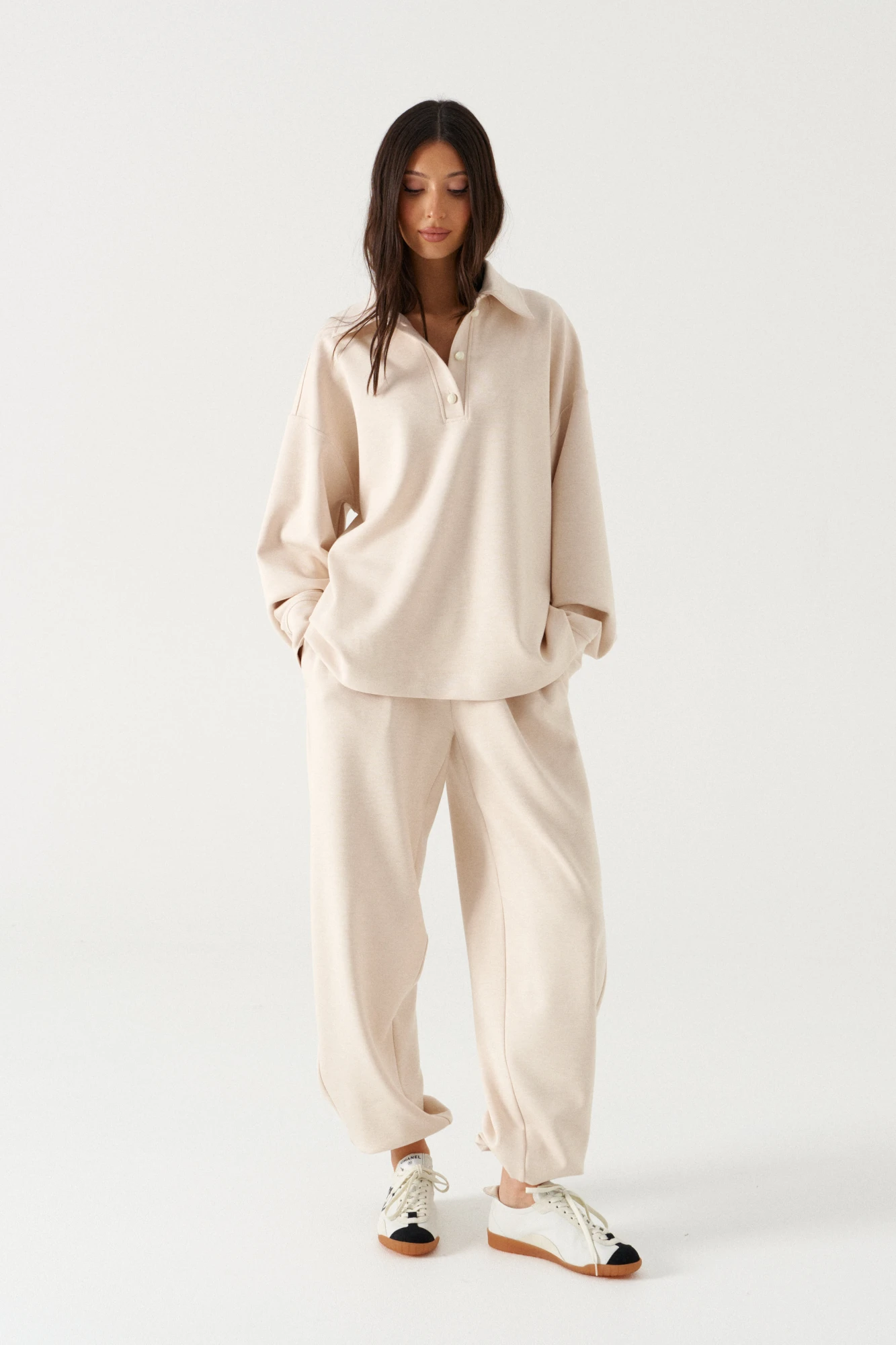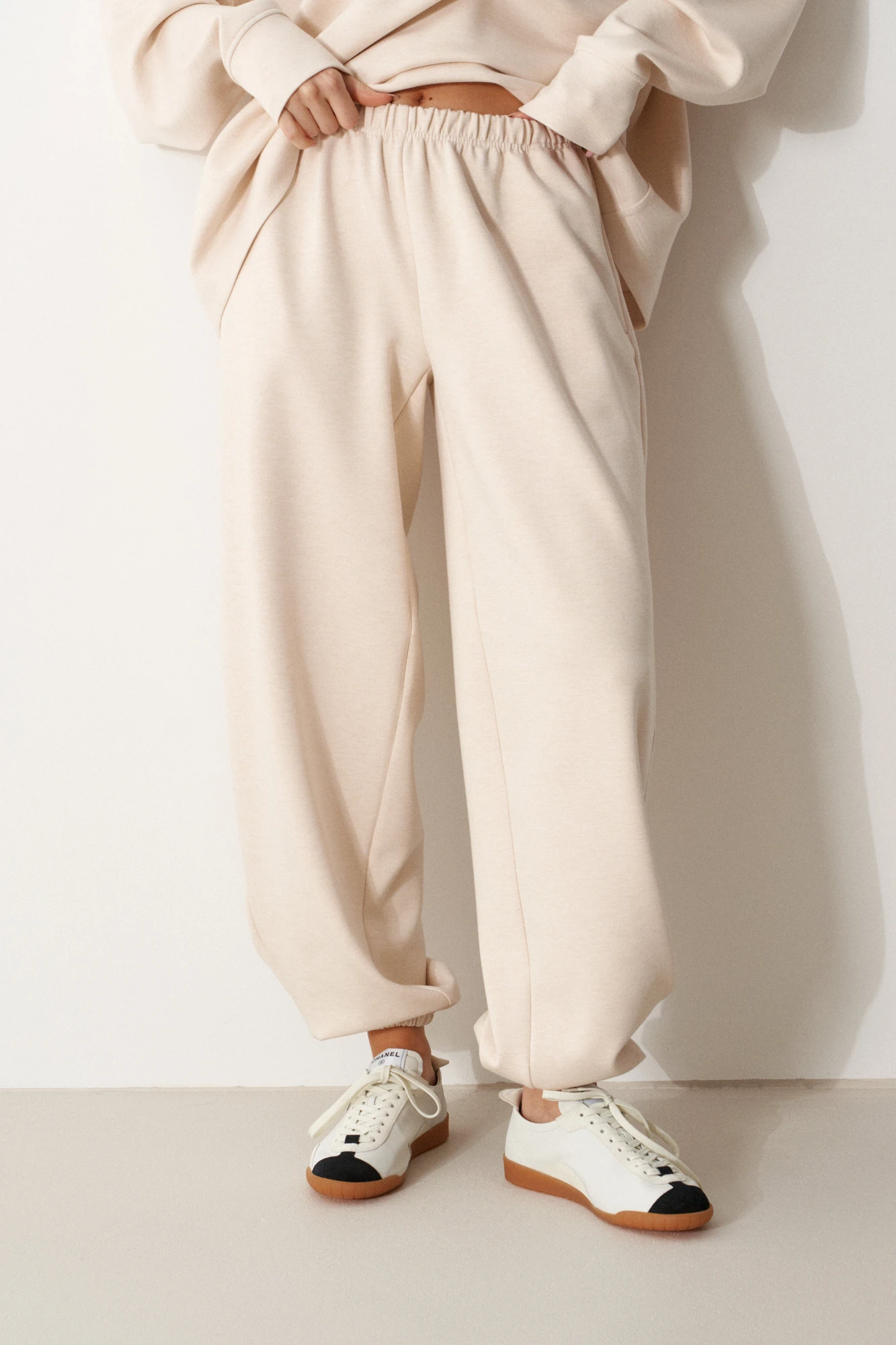 Брюки выполнены из трикотажного полотна молочного цвета. Характеристики: прямой крой, пояс на резинке с кулиской, в боковых швах карманы, накладные карманы на задней части брюк, штанина внизу на резинке с фиксатором. Длина по боковому шву 100 см.