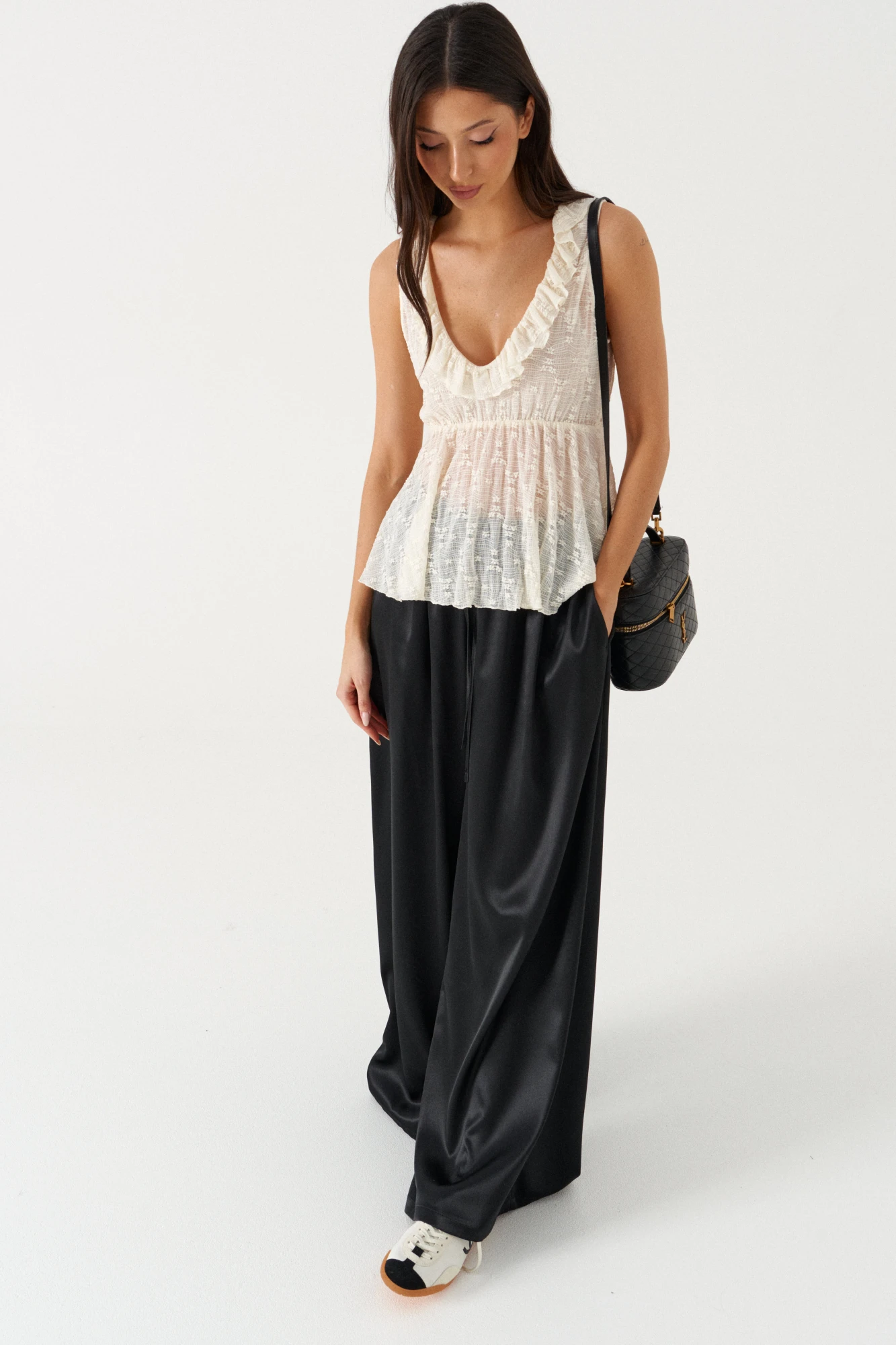 Брюки свободного кроя. Выполнены из мягкой струящейся ткани чёрного цвета. Пояс на резинке, со шнурочком. В боковых швах карманы. Длина бокового шва (с учётом пояса) 107 см