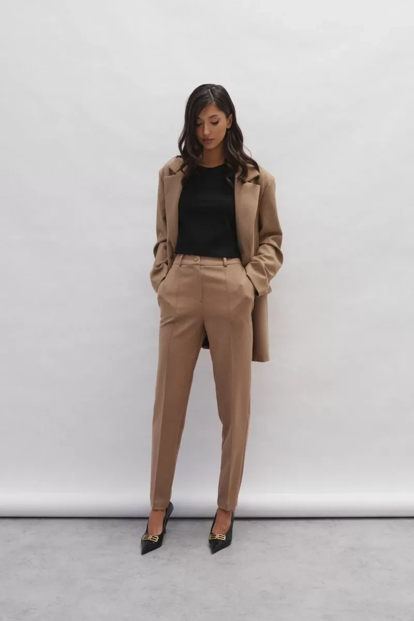 Брюки зауженные к низу выполнены из полотна цвета песок. Характеристики: зауженные к низу, пояс стабильный, по поясу нашиты шлевки, застежка пуговичка молния, по переднему и заднему полотну брюк застроченные стрелки, в боковых швах карманы. Длина 102 см.