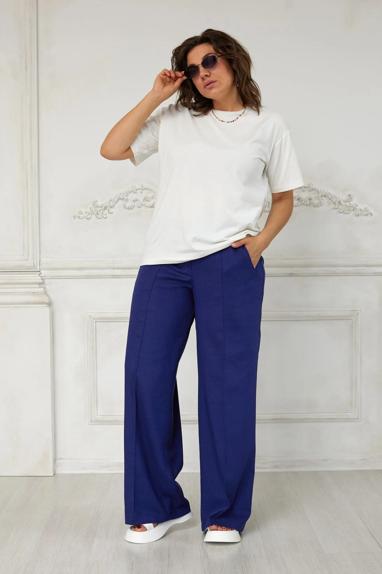 Брюки свободного кроя, комфортной носки. Главная особенность в том, что они делают любые ноги визуально длиннее за счёт застроченных стрелок по передней части. Пояс притачной, без застёжки, частично с эластичной резинкой. В боковых швах имеются карманы с отрезным бочком.