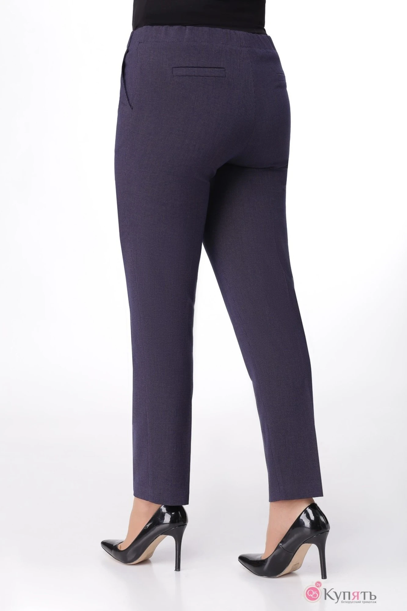 Брюки женские прямые, слегка зауженные к низу, по среднему шву с застежкой на тесьму-молнию, с цельнокроеным поясом, который застегивается на 1 петлю и пуговицу и с эластичной тесьмой, которая вставлена в пояс задних половинок. Брюки с наклонными карманами по передним половинкам, с имитацией карманов с листочкой по задним половинкам. Брюки классической длины, со стрелками.