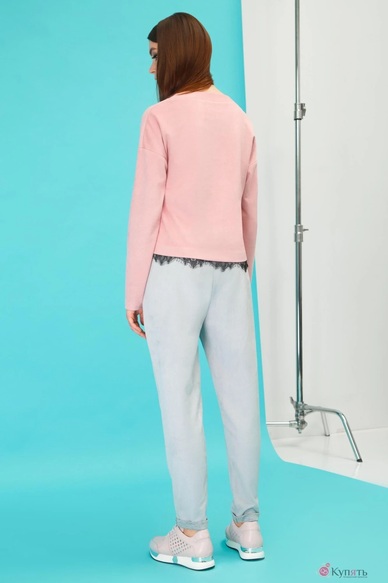 Брюки в светло-сером цвете, свободного непринужденного кроя, из мягкой, трикотажной искусственной замши. Кармашки и эластичный пояс.