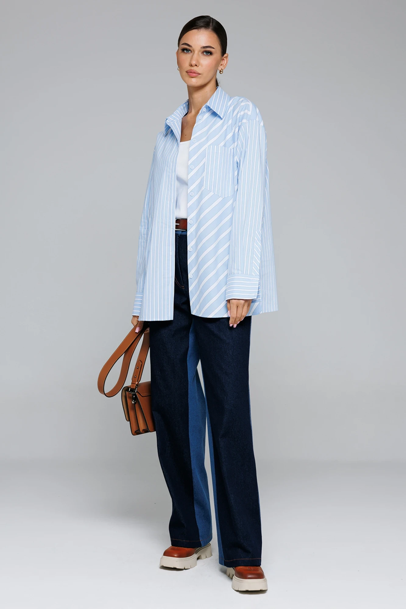 Брюки-джинсы, двухцветные, прямого силуэта. На приточном поясе со шлёвками, застежкой-гульфик. Пояс застегивается на петлю-пуговицу. Спереди карманы, сзади кокетка и накладные карманы.
