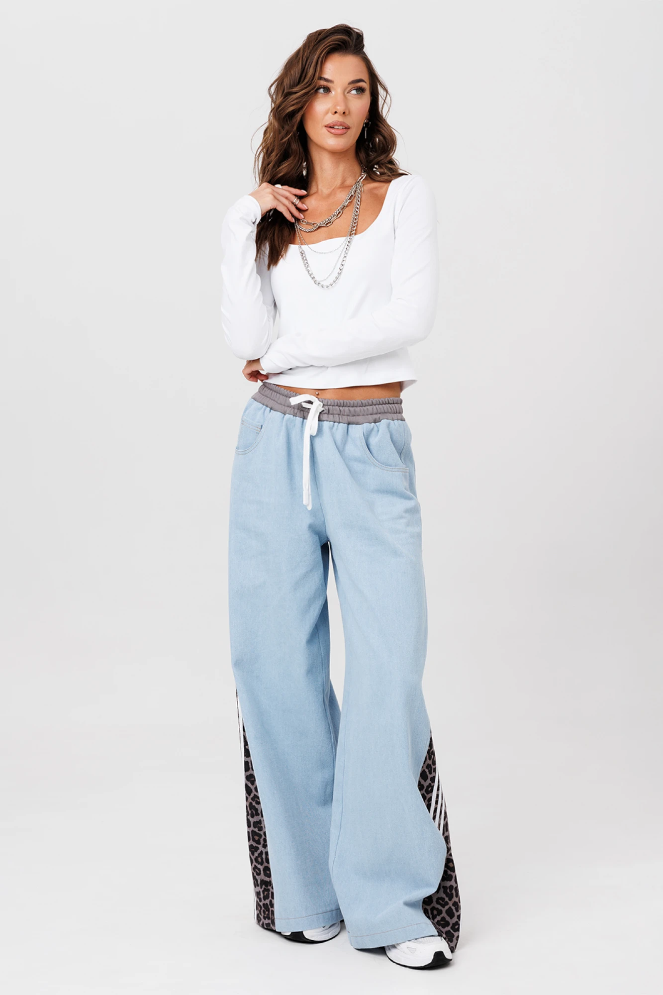 Брюки-джинсы, комбинированные, слегка расклешенные к низу. На притачном отстроченном поясе из трикотажного полотна с втянутым в него декоративным шнурком. По переду карманы. По спинке накладные карманы. По боковым швам вставлен клин из замшевой ткани с леопардовым принтом и настроченными на него лампасами .