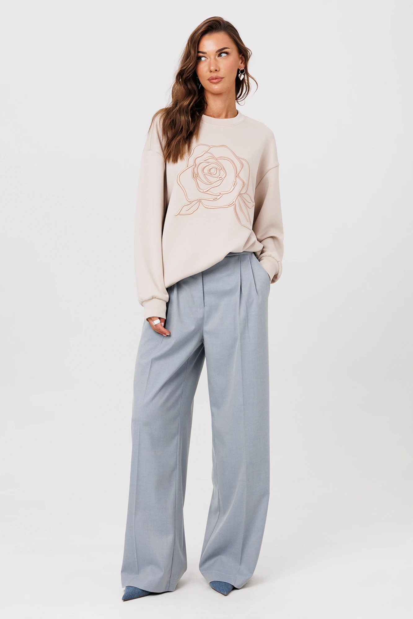 Брюки-палаццо на притачном поясе и застежкой-гульфик. Пояс застегивается на петлю-пуговицу. По переду со складками и карманами в боковых швах с наклонным входом. По спинке пояс на резинке.