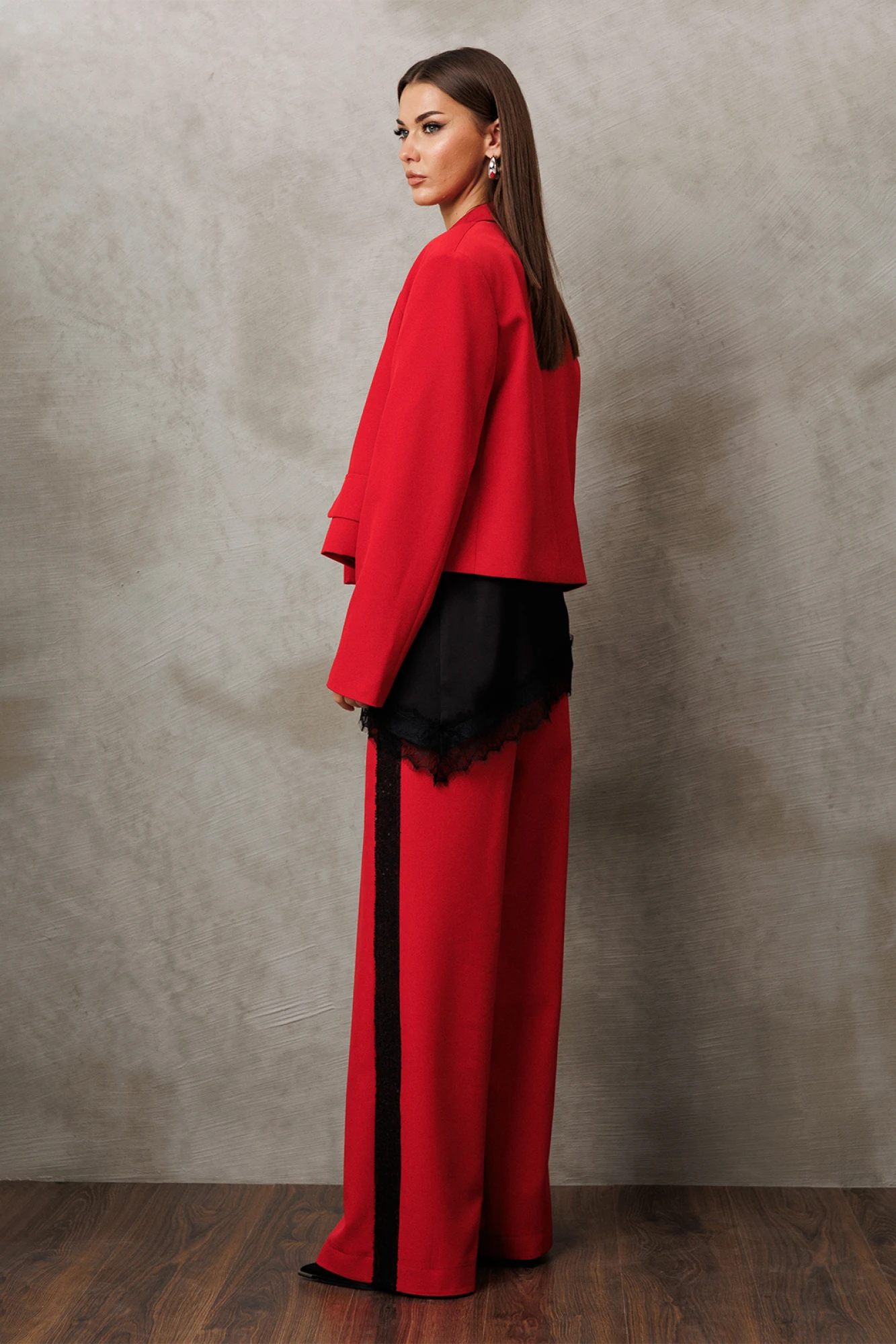 Брюки-палаццо из костюмной ткани с лампасом из пайеток. Брюки на притачном поясе и застежкой-гульфик. Пояс застегивается на петлю-пуговицу. По переду карман в шве притачивания к лампасу. По спинке пояс на резинке и вытачка от пояса.