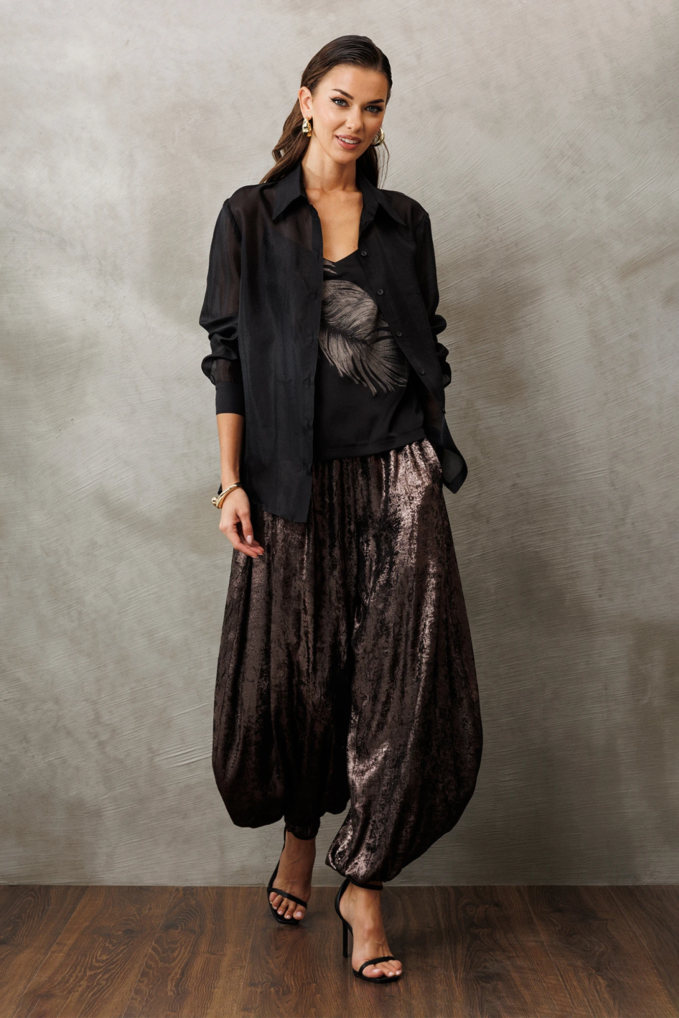 Брюки-шаровары свободного силуэта, внизу на резинке, на притачном отсроченном поясе, со вставленной в него резинкой. Полочка с карманом в рельефе. По переду и спинке фигурные рельефы.