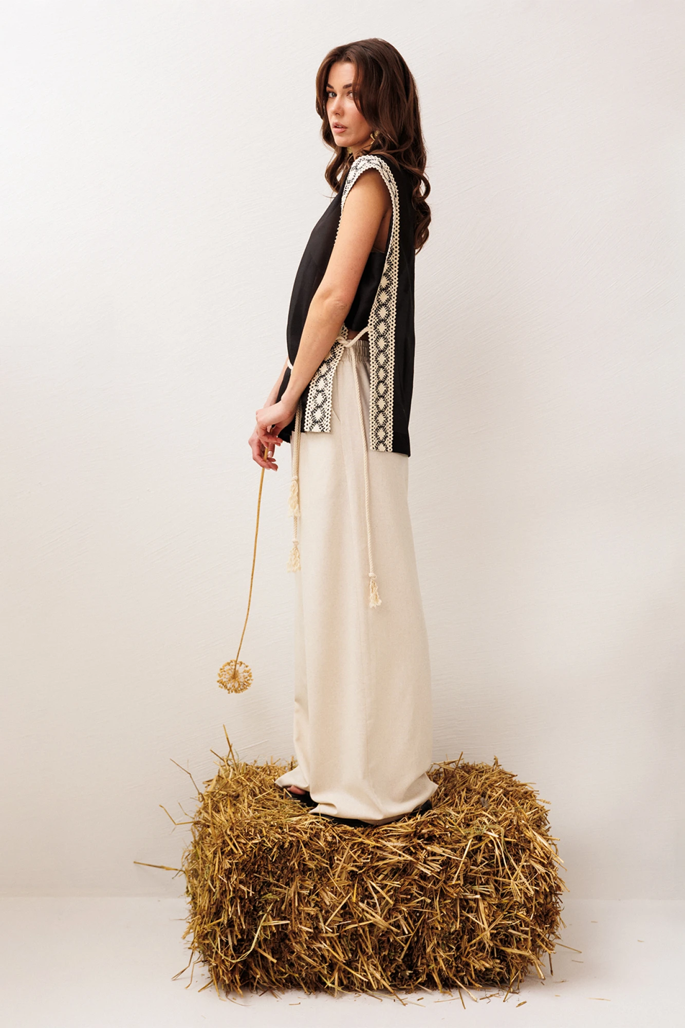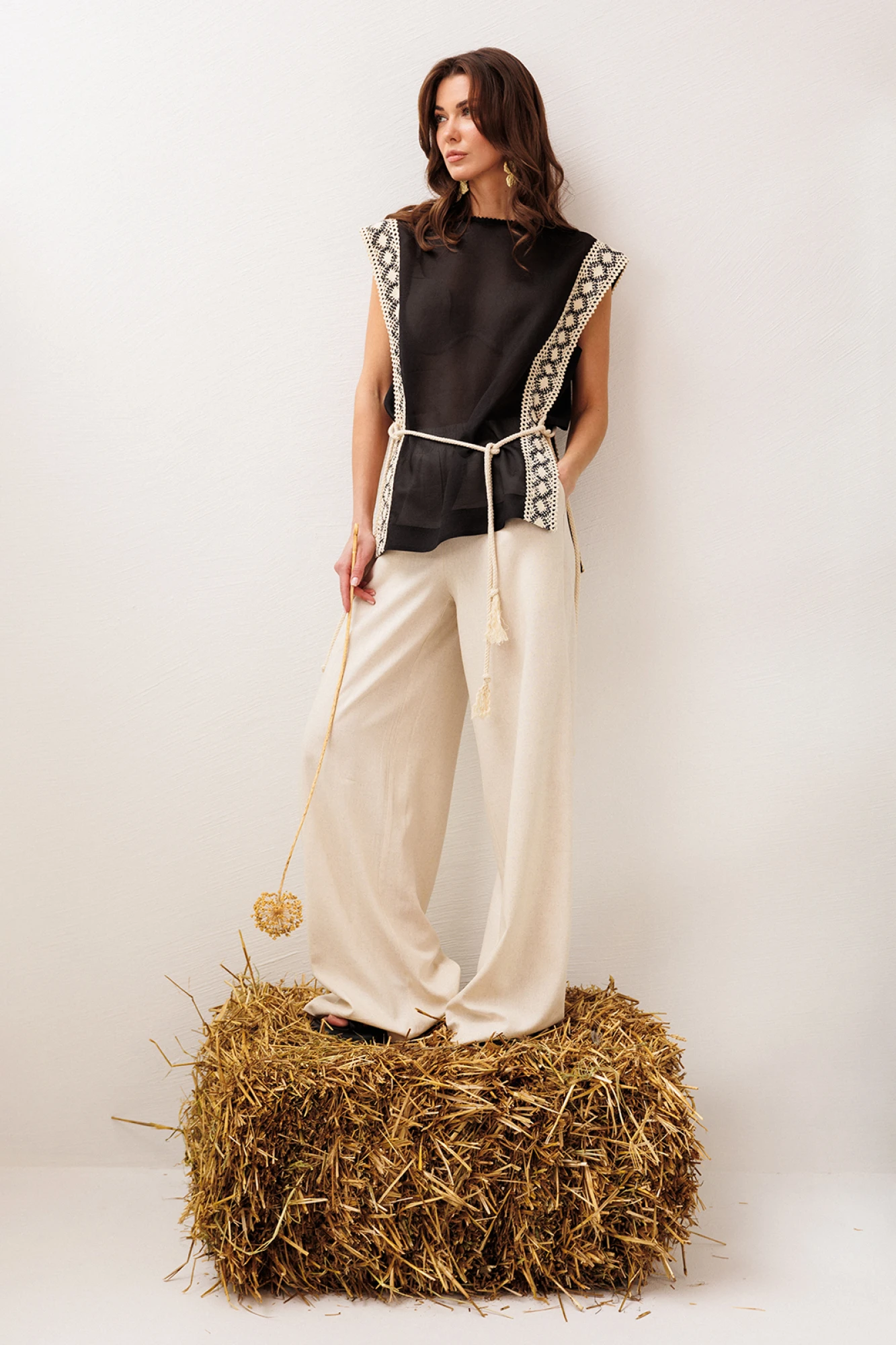 Брюки немного расширенные к низу, на притачном, отстроченном поясе на резинке, с карманами в боковых швах. Вверху по переду имитация застежки-гульфик