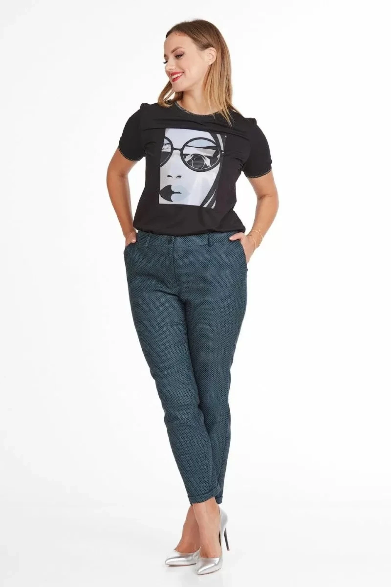 Брюки женские зауженные к низу, модной расцветки, на притачном поясе, с застежкой гульфик на молнию и петлю с пуговицей, с боковыми карманами.