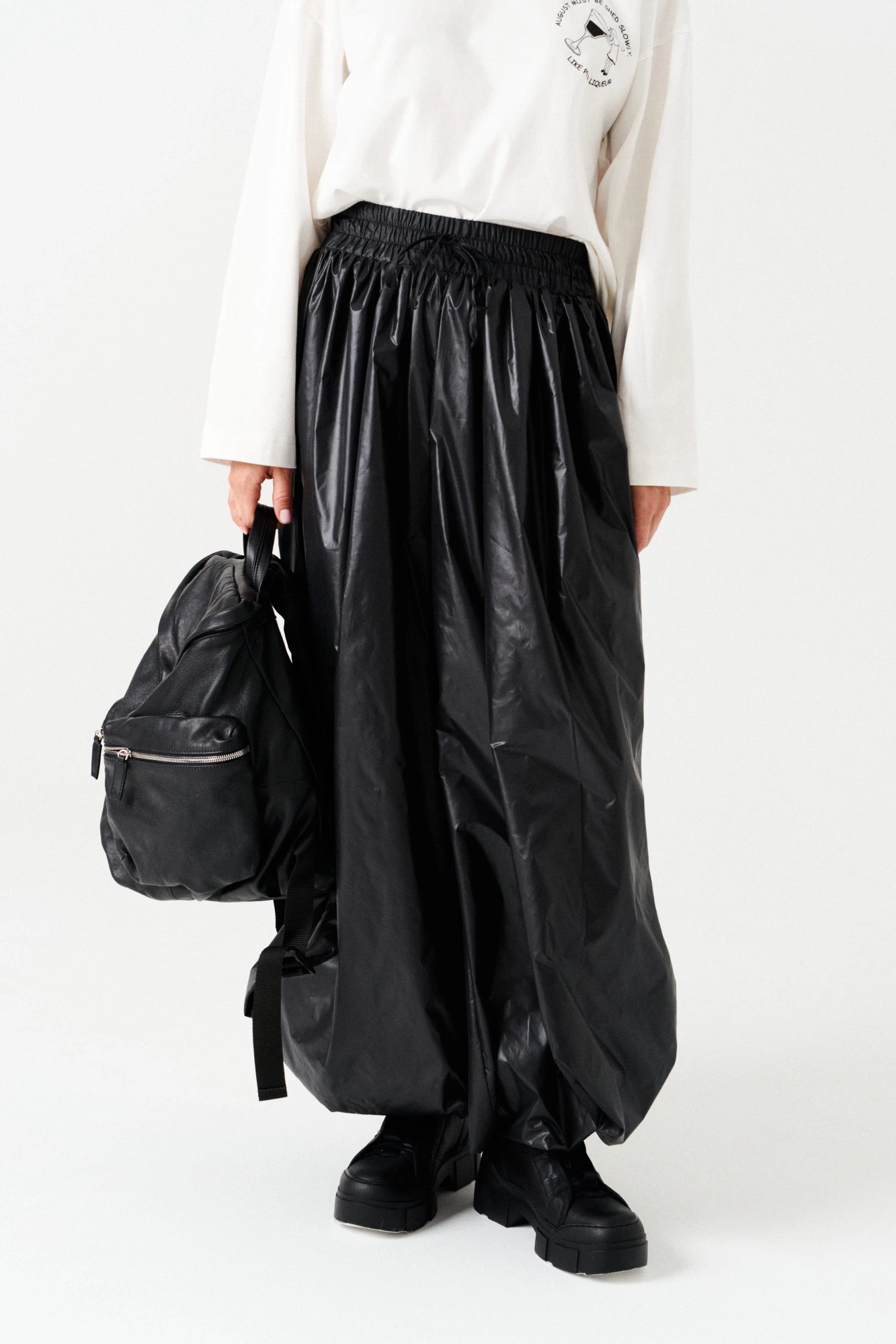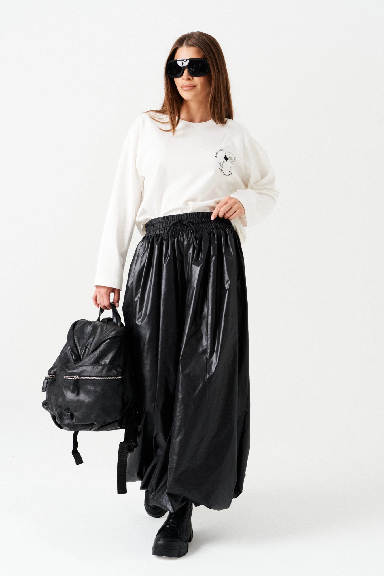 Брюки-джоггеры большого объема, со сборкой по верхнему и нижнему срезу, на притачной подкладке. Пояс на резинке с отделочными строчками, образующими кулису, в которую вставлен шнур-завязка. Низ брюк с сборкой на резинку. В боковых швах расположены карманы