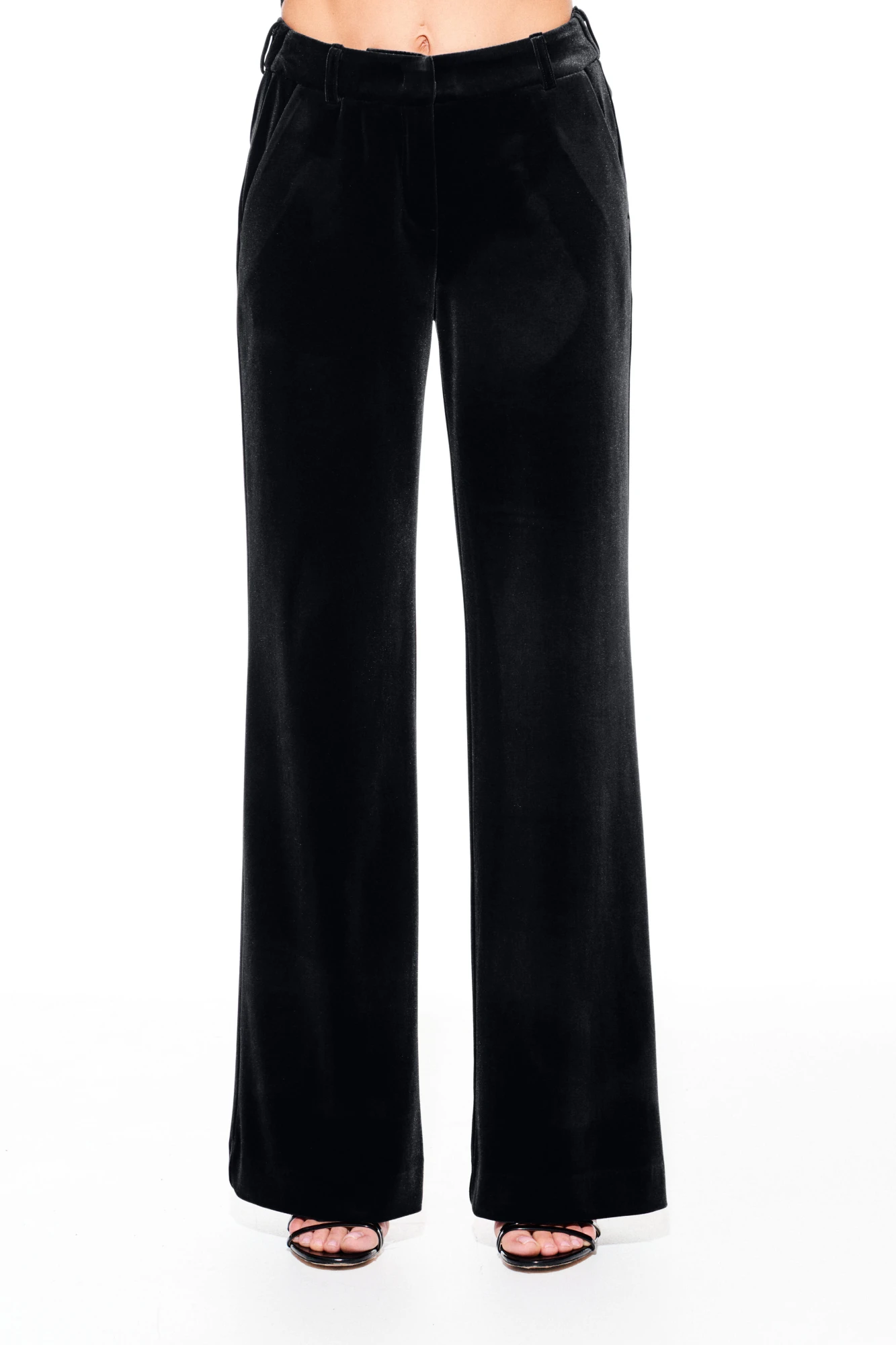 Брюки из бархата на трикотажной основе, умеренного объема, прямого силуэта. На передних половинках выполнены боковые карманы с отрезным бочком. Задние половинки с талиевыми вытачками. Застежка – гульфик на молнии. Пояс притачной, с резинкой по спинке, шлевками, застежкой на крючок и потайную пуговицу.