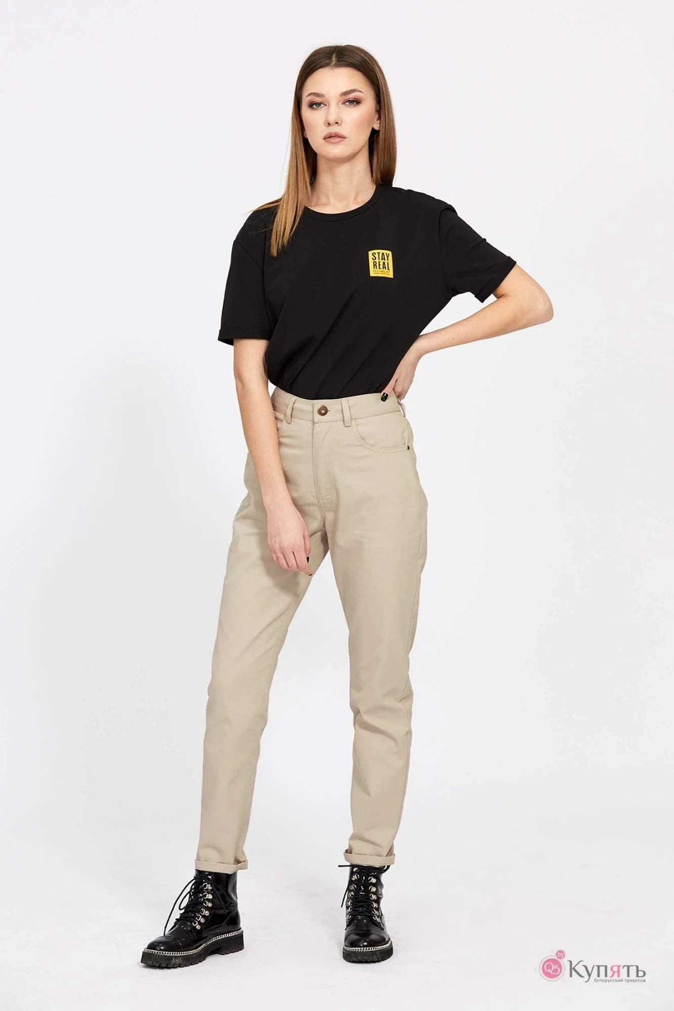 Брюки выполнены из джинса. На поясе со шлевками, с застежкой спереди на металическую молнию и металлическую пуговицу. Спереди фигурные карманы в боковых швах, сзади накладные карманы.