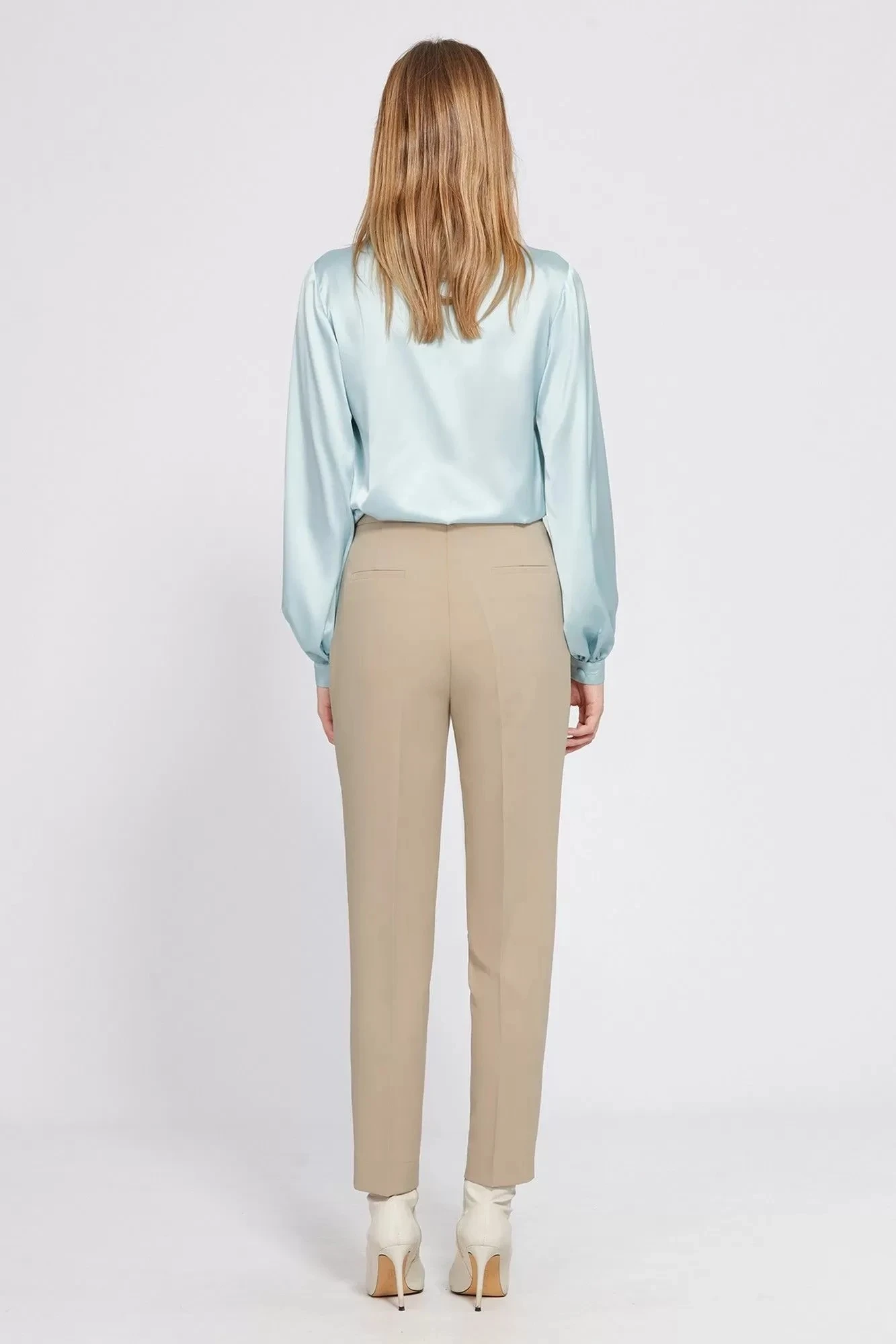 "Брюки выполнены из однотонной костюмной ткани, заужены к низу, на задних половинках карманы с листочкой, застежка в боковом шве на потайную молнию и пуговицу. По низу в боковом шве разрезы.