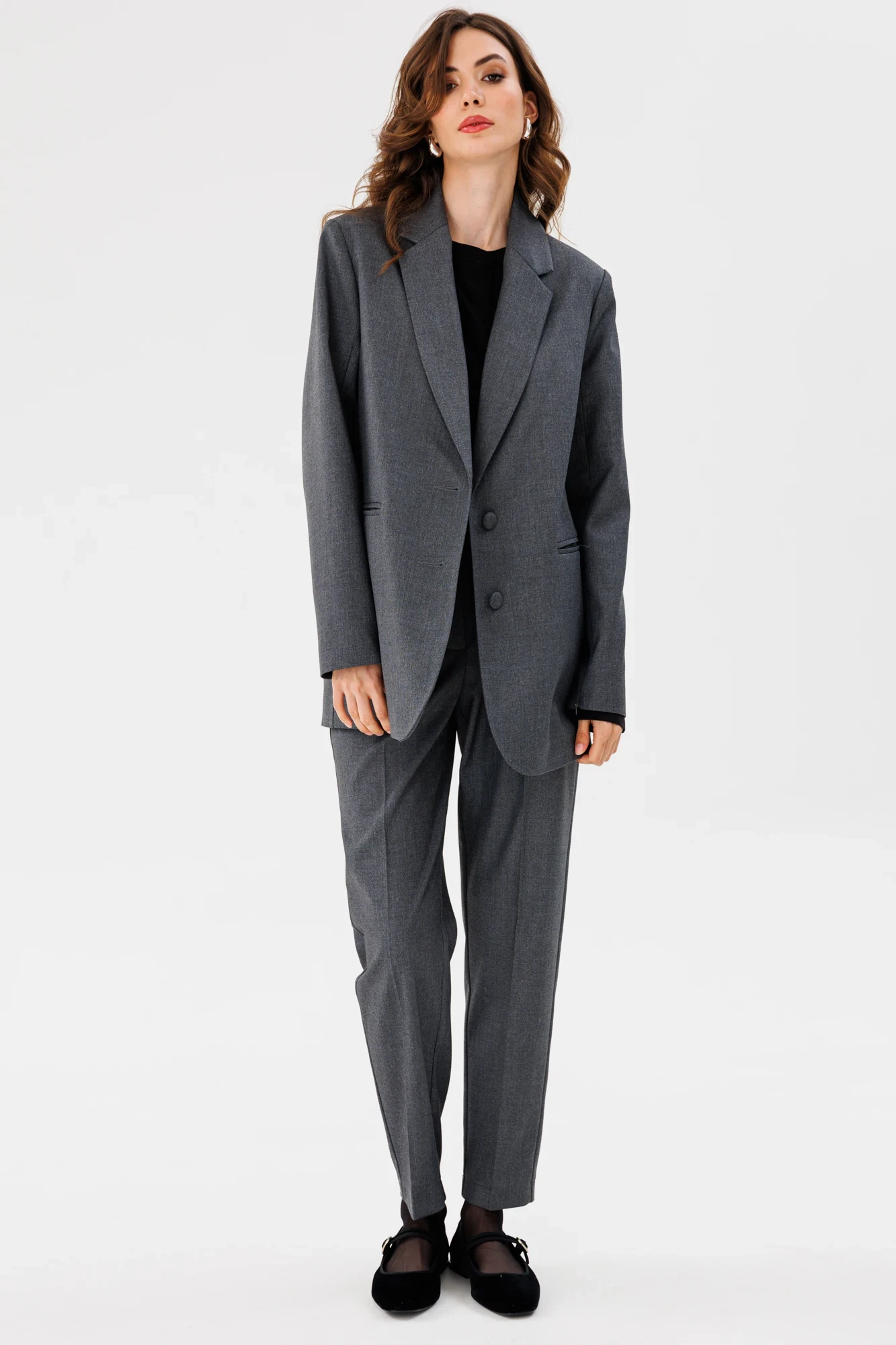 Брюки выполнены из костюмной ткани. Брюки зауженные к низу, длиной 7/8, на притачном поясе. Спереди боковые карманы с наклонным входом и застежка на молнию. Сзади декоративные карманы с листочкой.