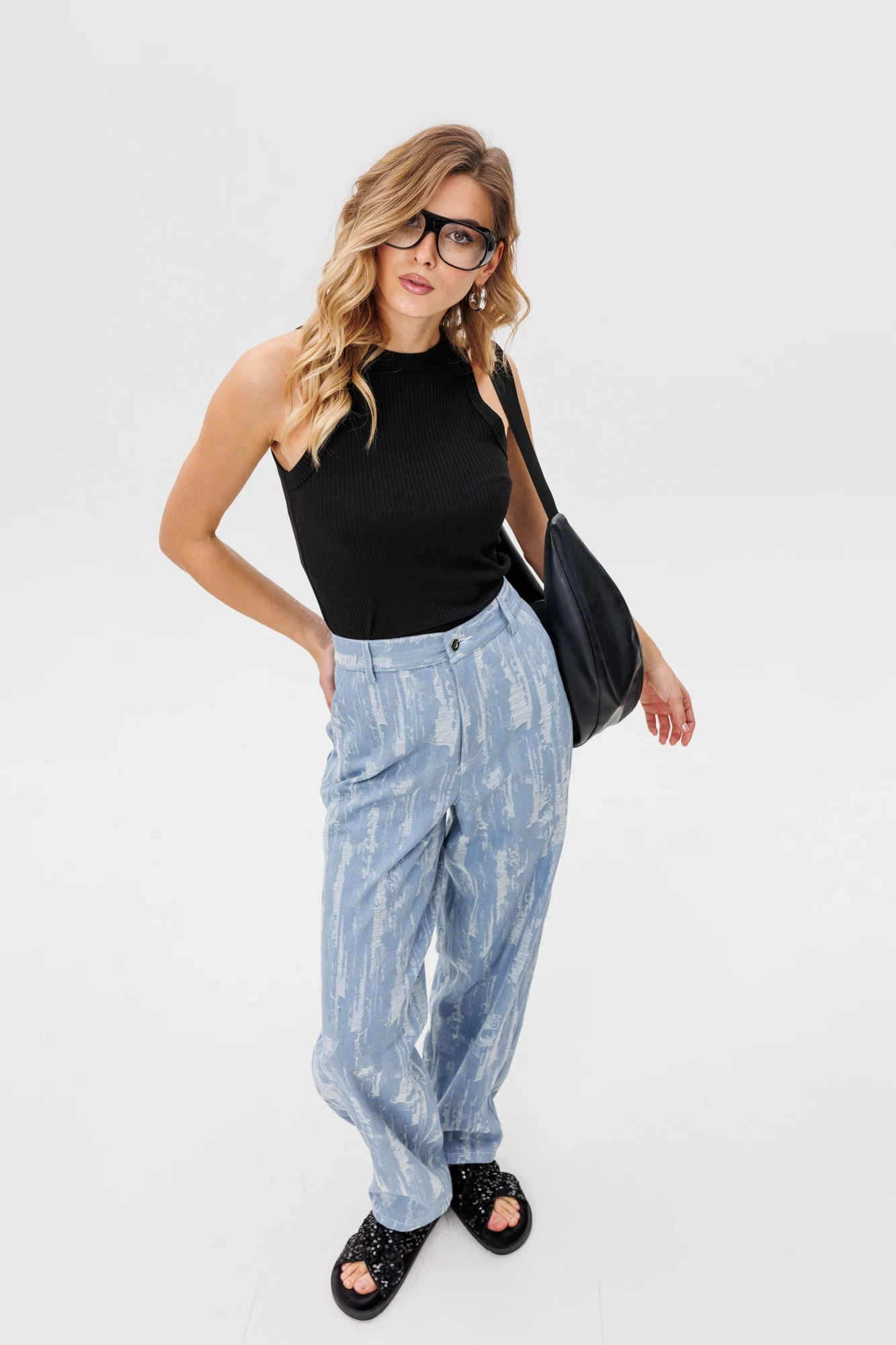 Брюки выполнены из джинса. Брюки свободного покроя на притачном поясе. Спереди боковые карманы с фигурным входом и застежка на молнию. На задних частях кокетки и накладные карманы. Пояс застегивается на одну пуговицу.