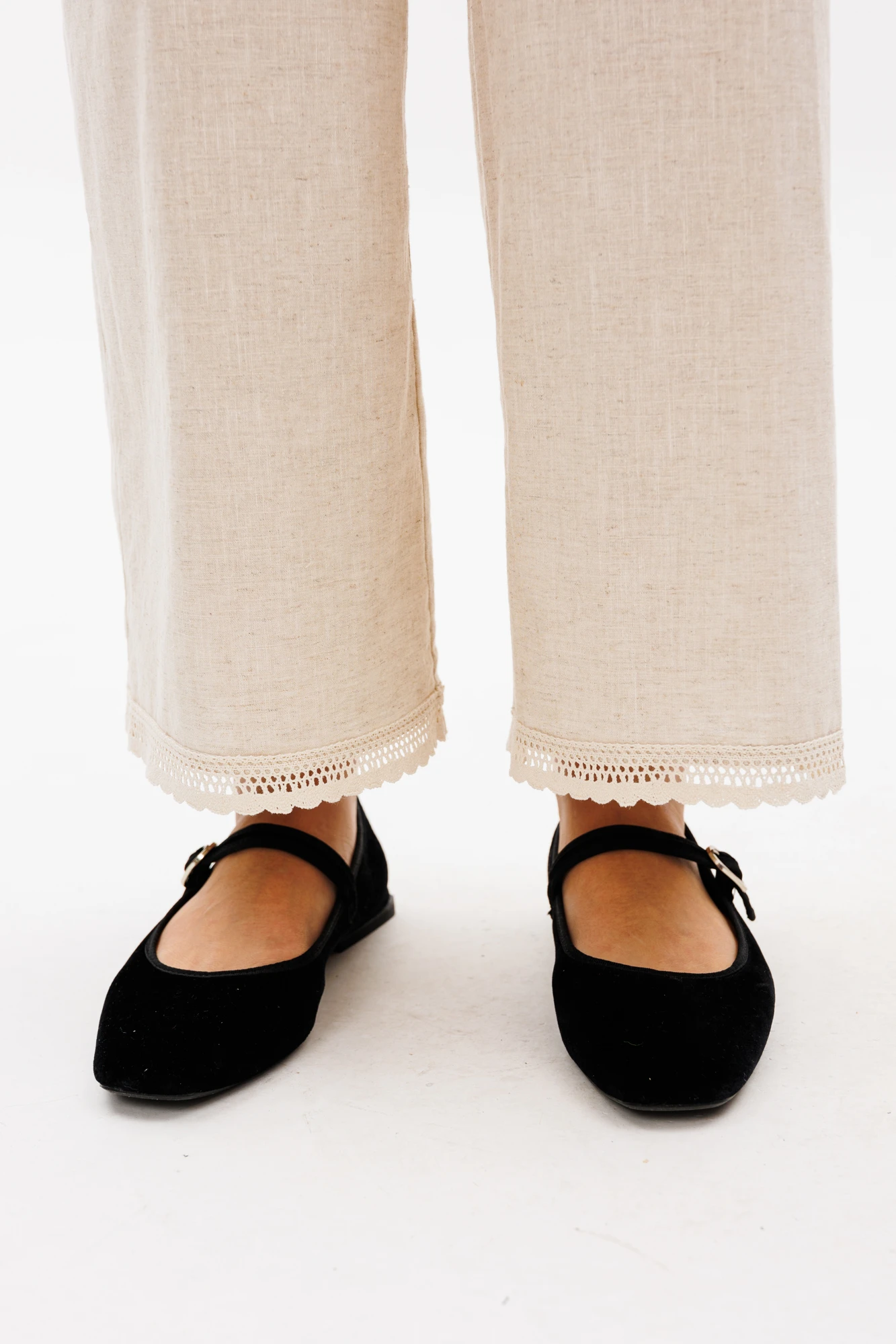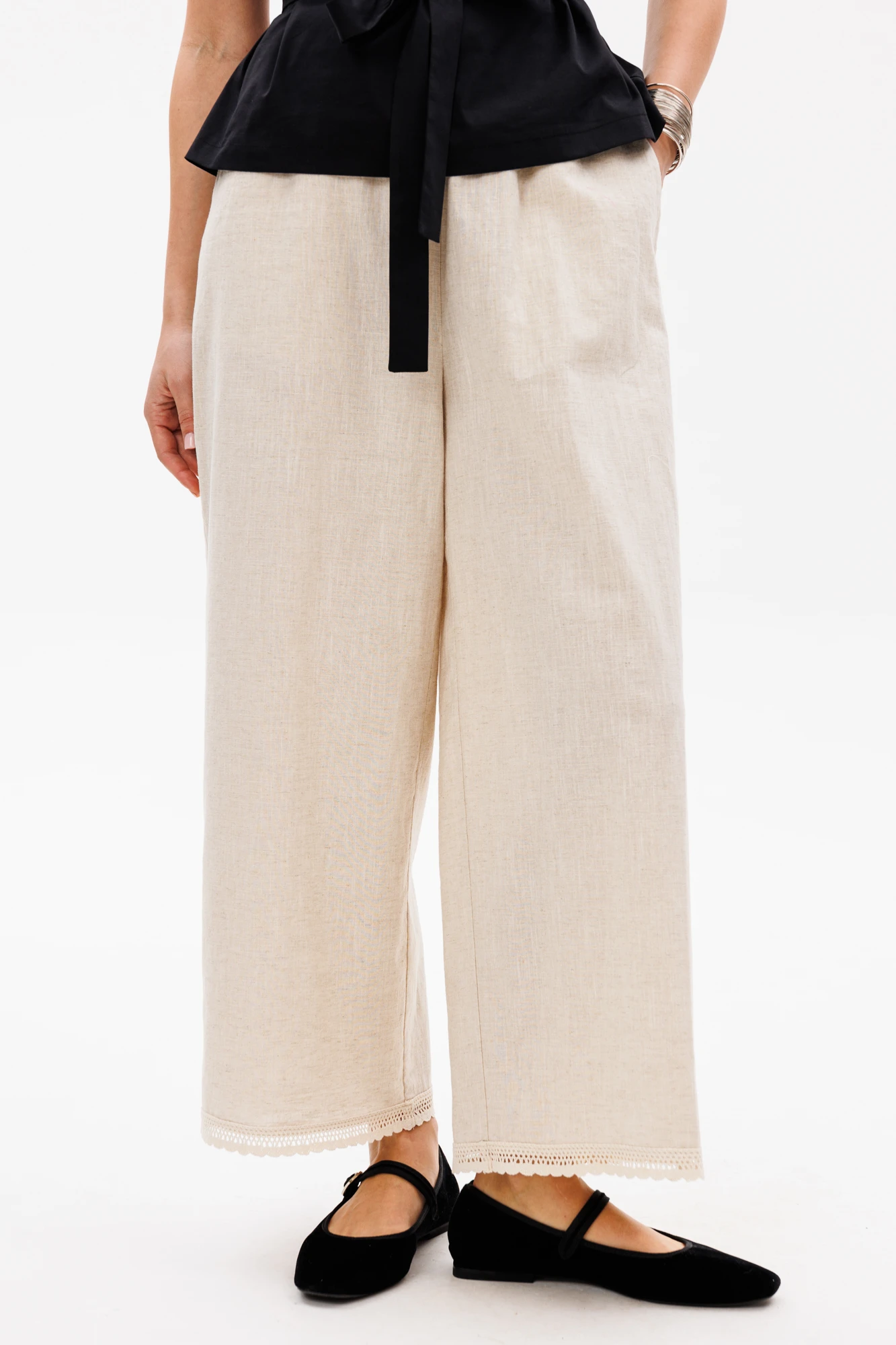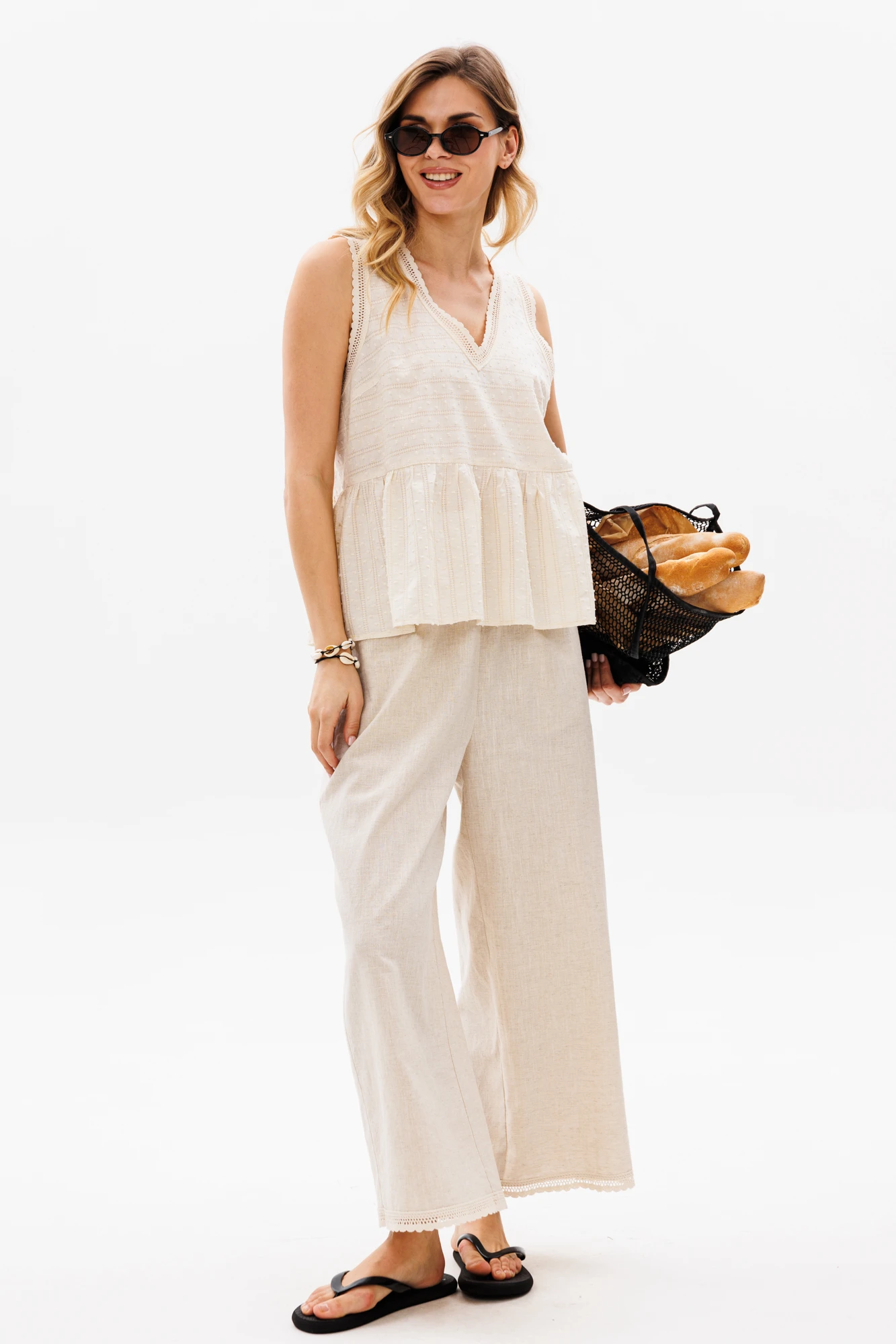 Брюки выполнены из плательно-блузочной ткани. Брюки прямого силуэта, длиной 7/8, на поясе с эластичной тесьмой. Спереди боковые карманы с наклонным входом. Брюки декорированы отделочной тесьмой по низу.