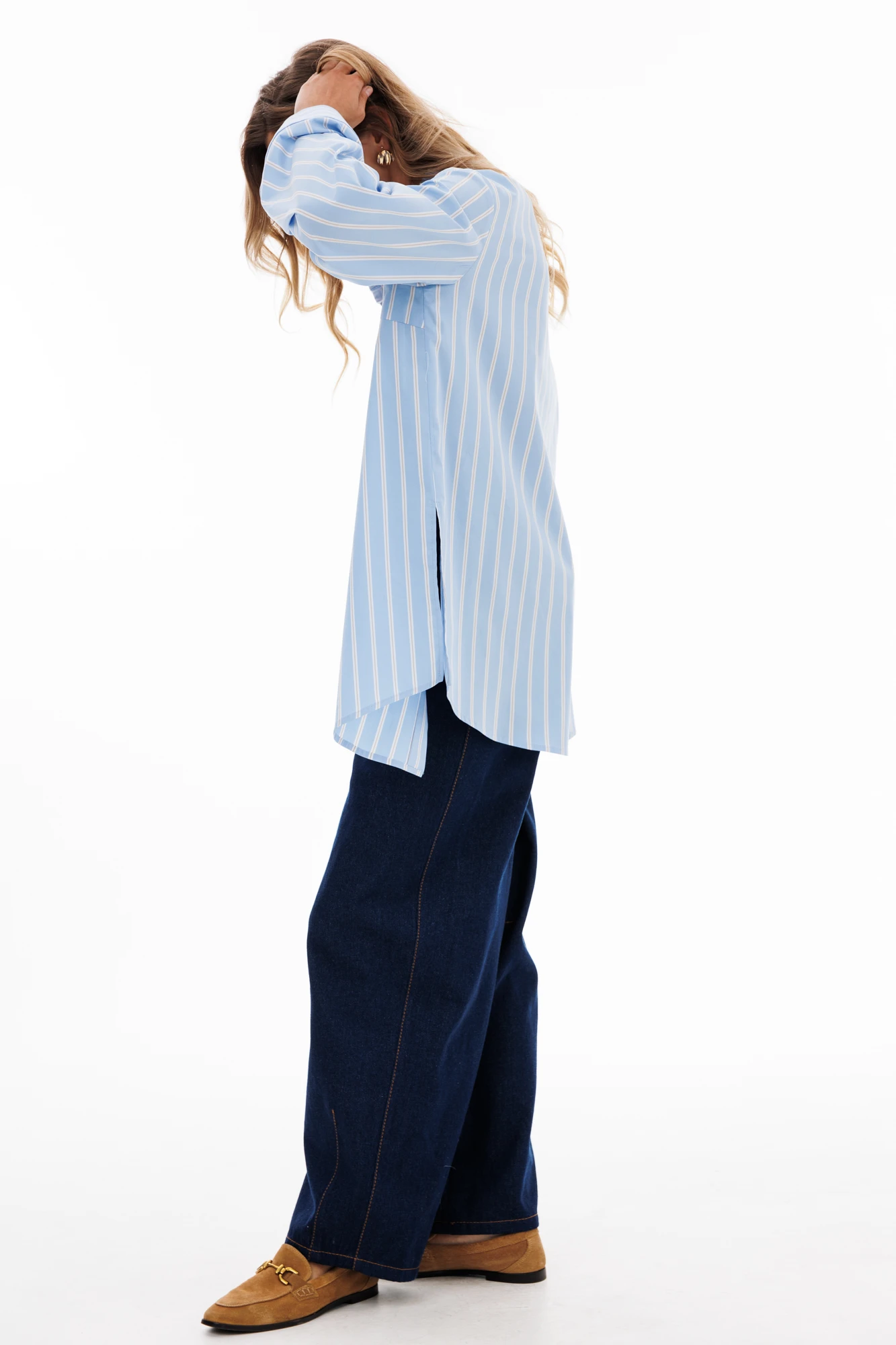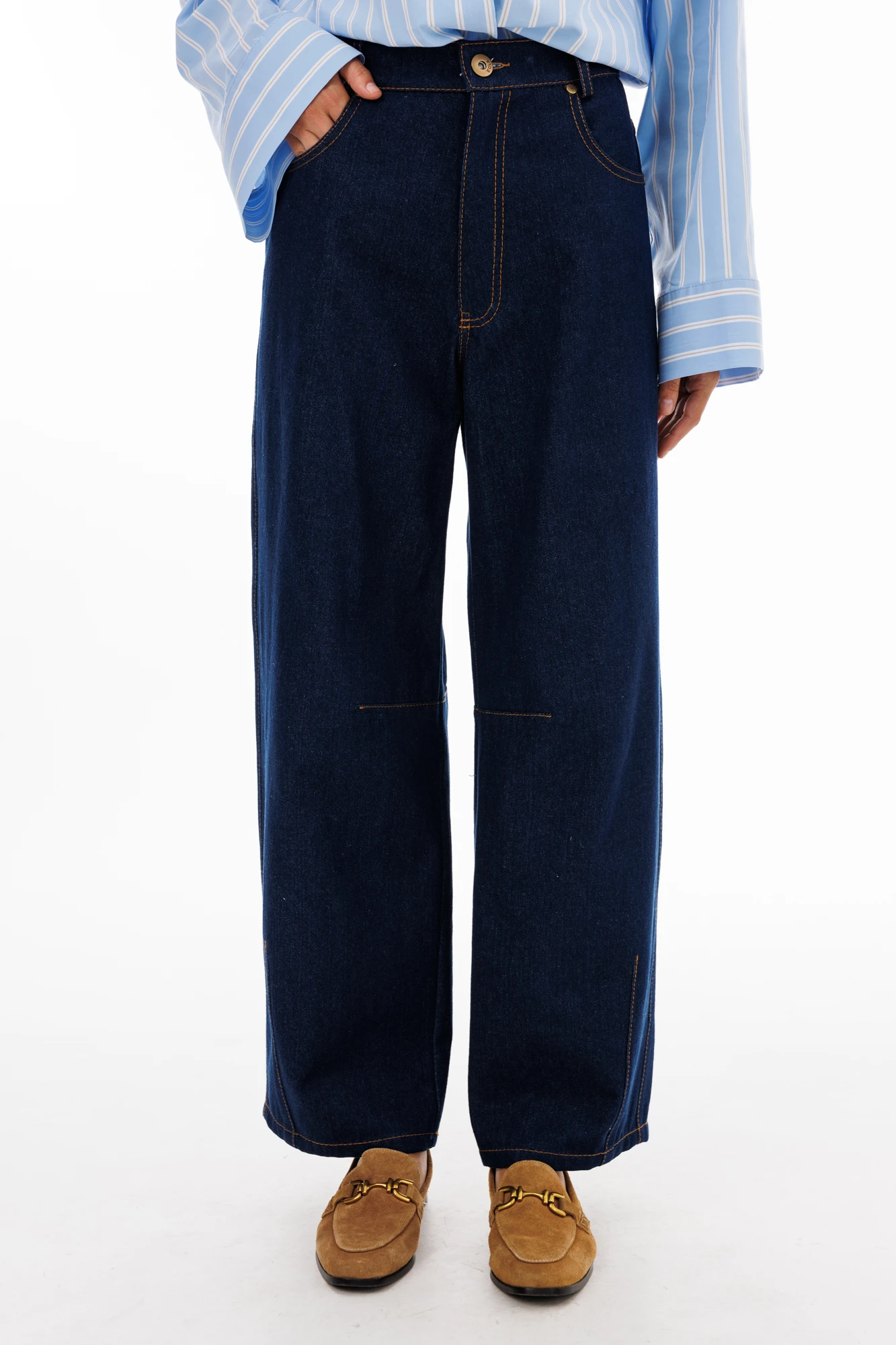 Брюки-багги выполнены из плотного джинса. Брюки на притачном поясе, длиной до линии щиколотки, расширенные от бедер и слегка зауженные к низу. Спереди боковые карманы с фигурным входом. Застежка на пуговицу и молнию с гульфиком. На задних частях кокетки и накладные карманы. На передней и задней части коленные вытачки.