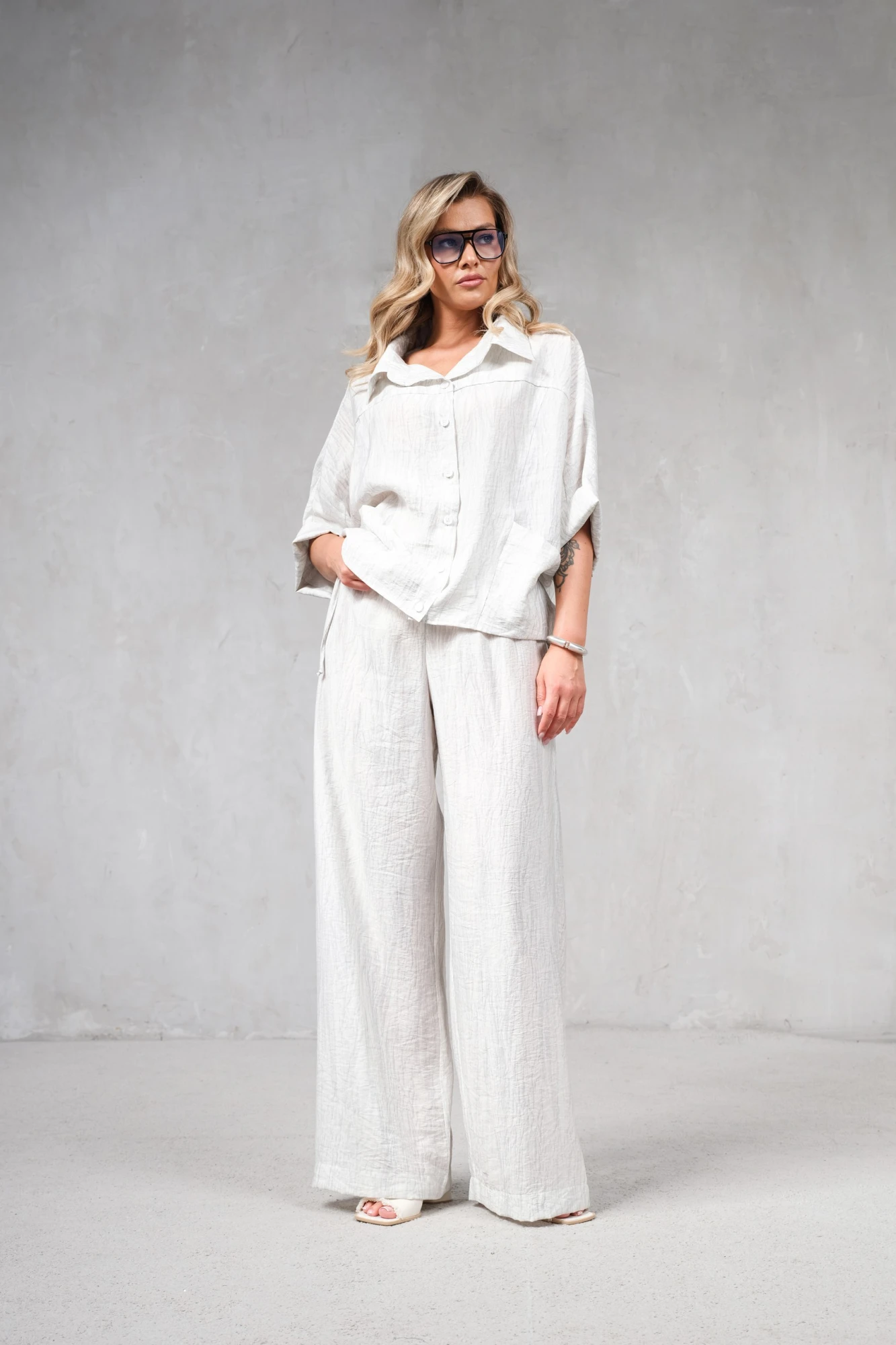 Брюки широкие, прямые, Пояс на резинке, карманы в боковом шве. Ткань с легким крэшированным эффектом.