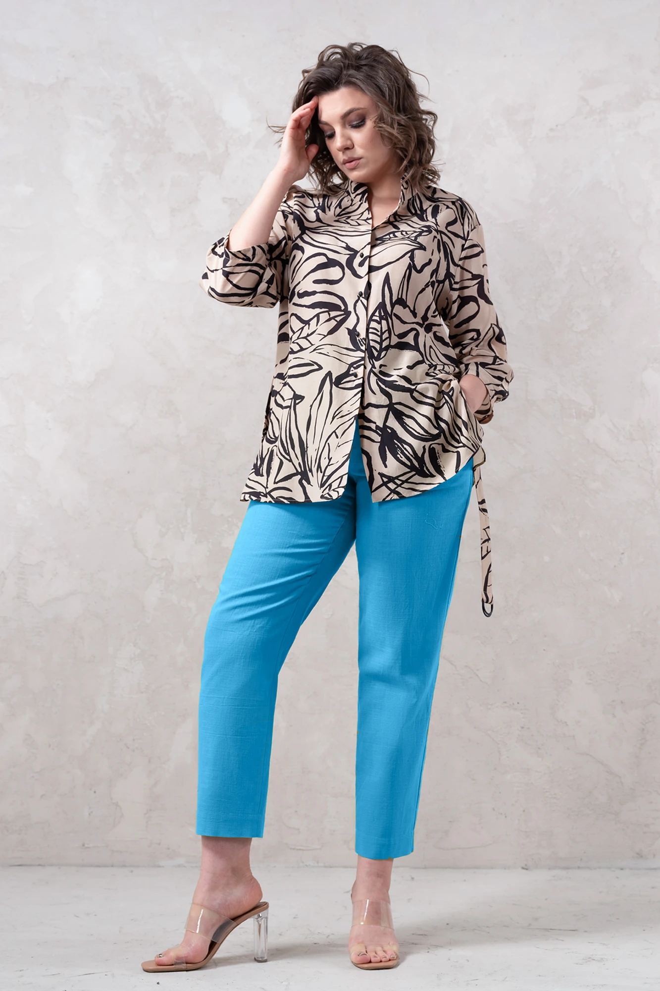 Льняные брюки классического кроя. Застежка спереди на молнию. На переде удобные карманы в швах. Пояс по спинке на резинке. Ткань немного тянется.