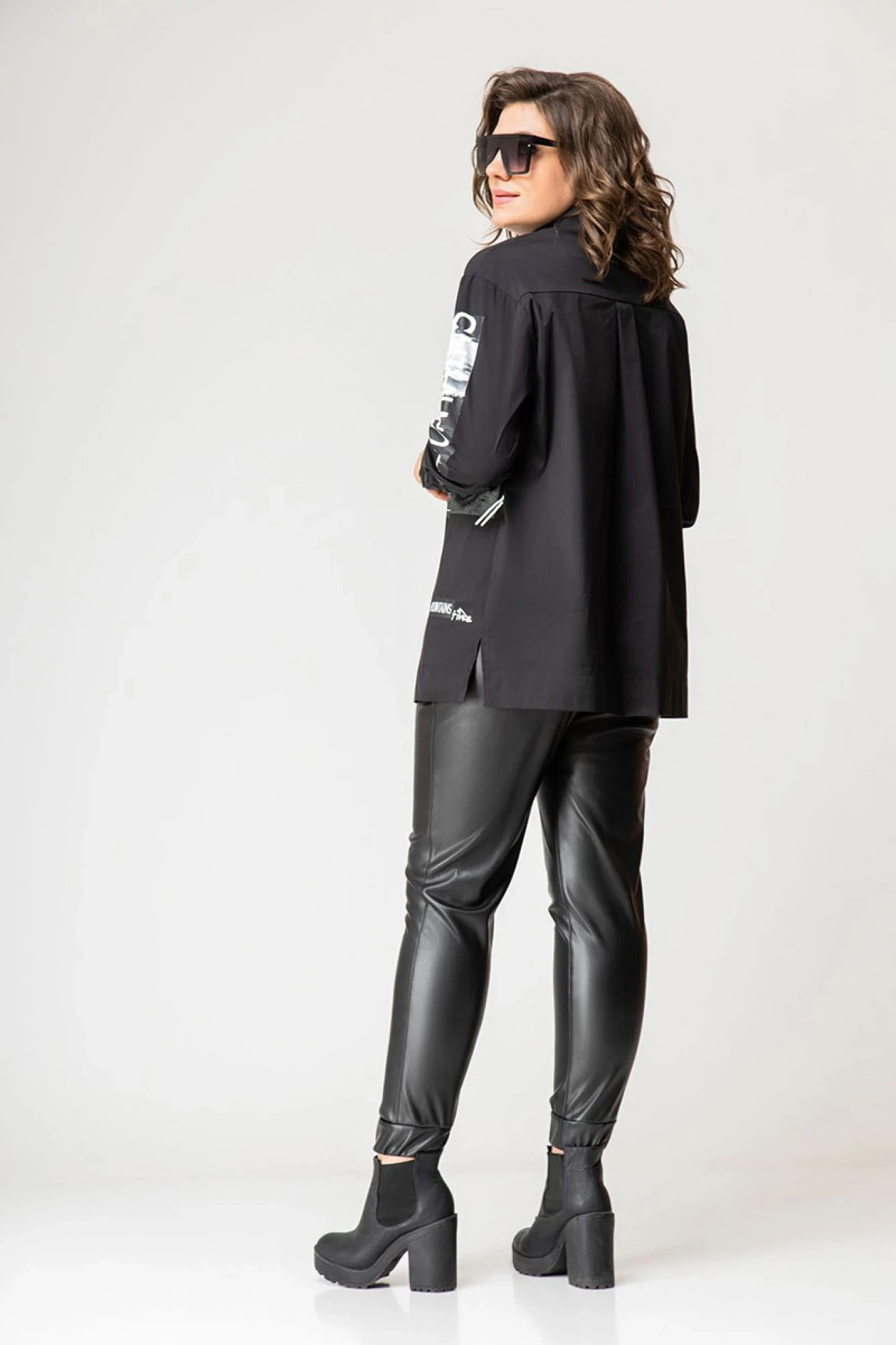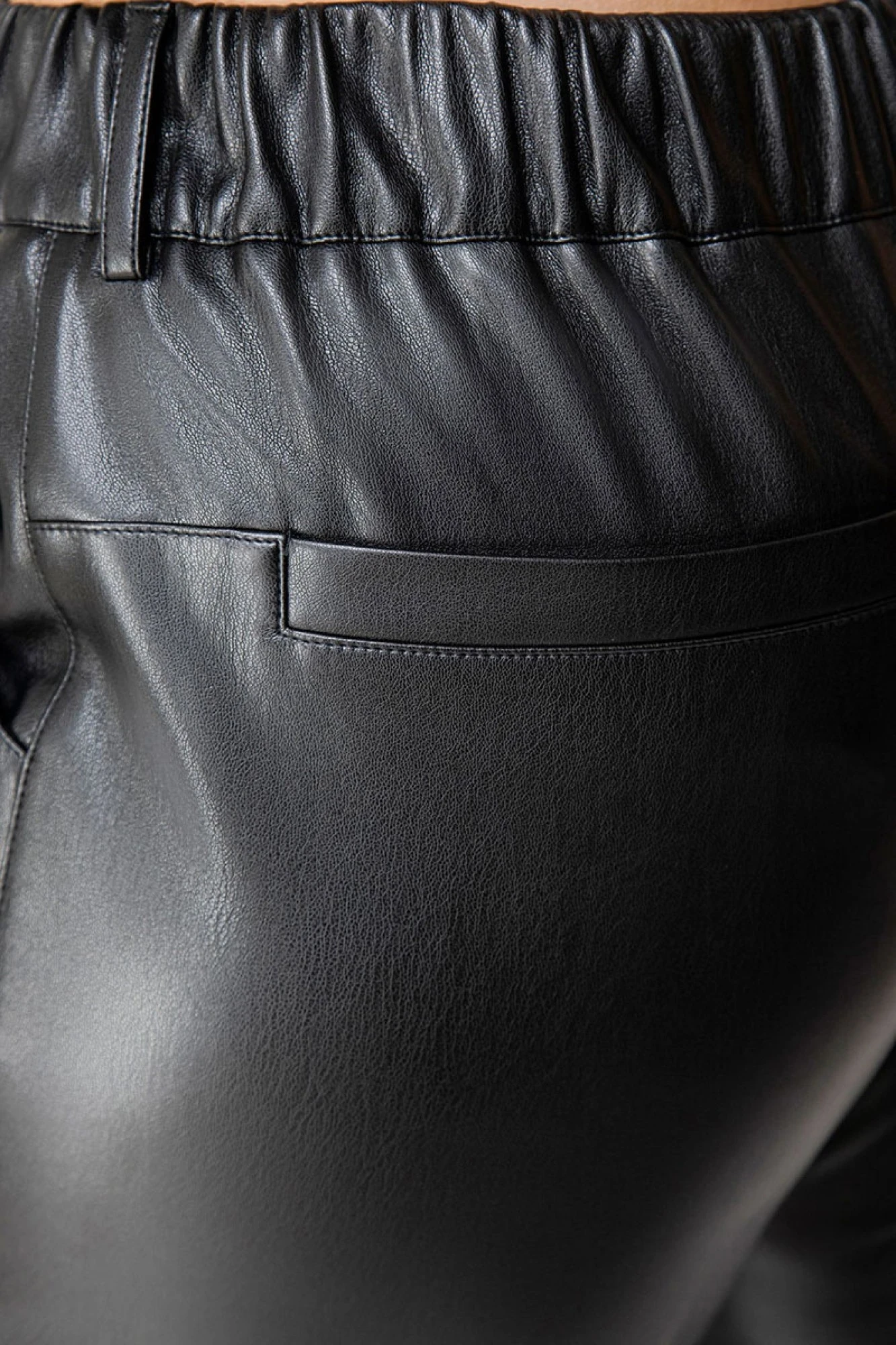 "Брюки женские на притачном поясе, выполнены из искуственной кожи-стрейч. Застежка центральная на молнию и пуговицу. В боковы швах обработаы карманы, на задней половике брюк имитация карманов. Низ брюк притачая манжета на широкой резинке. По талии частичная резинка на поясе.
