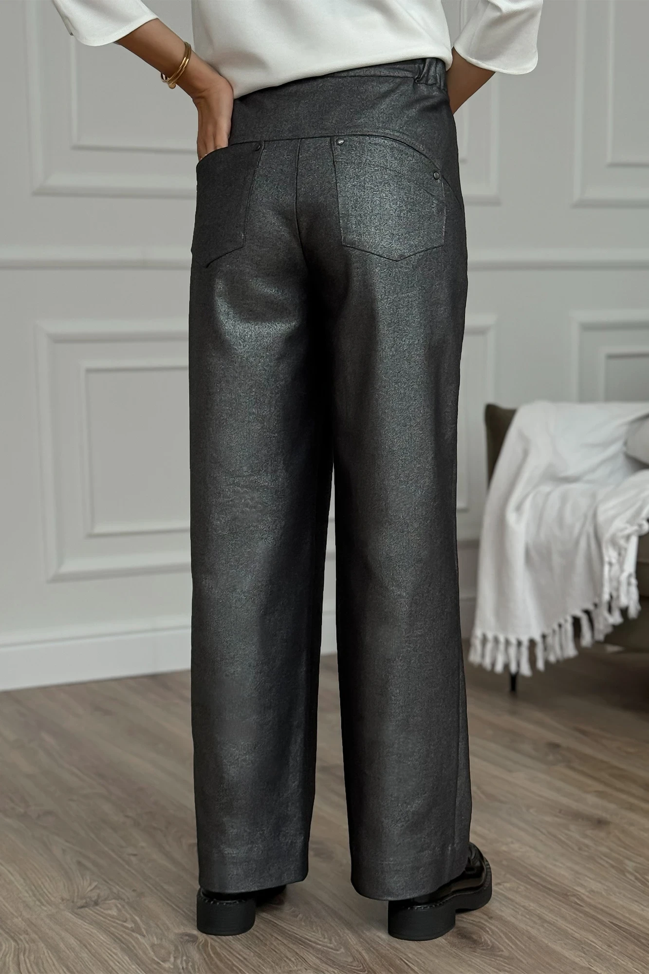 Брюки женские, прямые. По переду застрочены вытачки, обработаны боковые карманы с фигурным входом, обработана застежка на молнию. Задние половинки брюк с кокеткой и фигурными накладными карманами из ткани-компаньона. Верх обработан притачным поясом, застегивающимся на кнопку. Сзади пояс резинкой. Декоративные элементы и фурнитура могут отличаться от заявленных на фото. Цвет материала может отличаться по тону в зависимости от настроек вашего монитора!