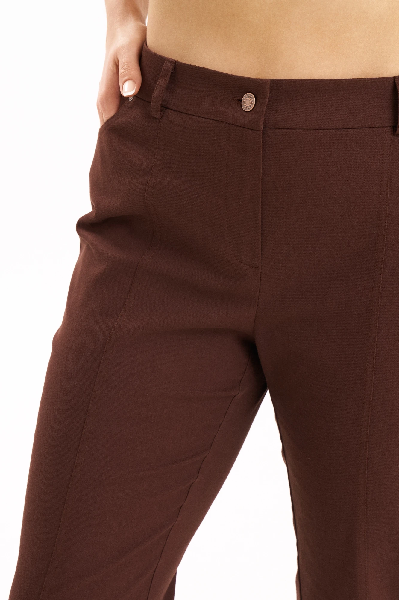 Брюки базовые с отделкой на передних и задних половинках. Изделие имеет комфортную среднюю посадку. Брюки на притачном поясе со шлёвками. Застежка на гульфик с молнией и пуговицу. Спереди боковые функциональные карманы, сзади накладные карманы. На карманах расположены холитены.