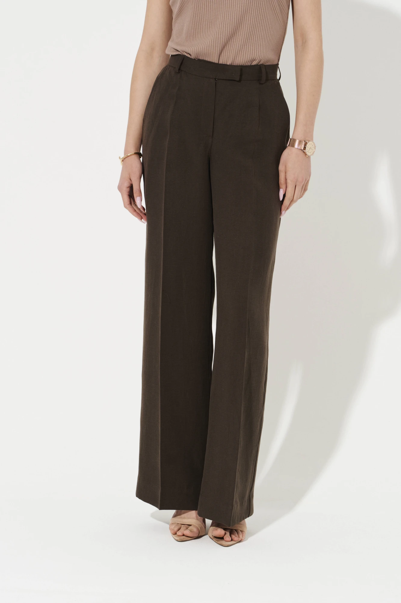 Брюки женские прямые из смесовой ткани с добавлением льна для повседневной носки. Верхний срез брюк обработан притачным поясом, застежка на один крючок, а также имеется застежка на тесьму-молнию в среднем шве брюк. Пояс брюк имеет шлевки, что дает возможность носить с ремнем. Задняя часть брюк имеет талиевые вытачки. В брюках расположен в боковом шве карман с подкройным бочком. Отличный классический вариант брюк, который станет базовой вещью в вашем гардеробе.
