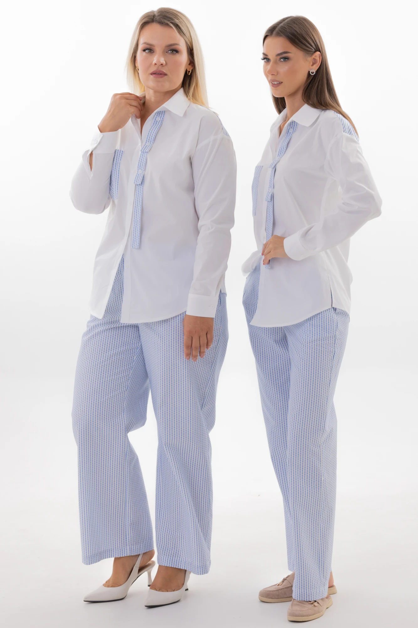 Идеальные для создания строгого и элегантного образа, прямые брюки средней посадки из ткани в полоску станут универсальным элементом вашего гардероба. Модель с заутюженными стрелками по переду и спинке подчеркивает безупречный крой, добавляя образу аккуратности и сдержанного шика.