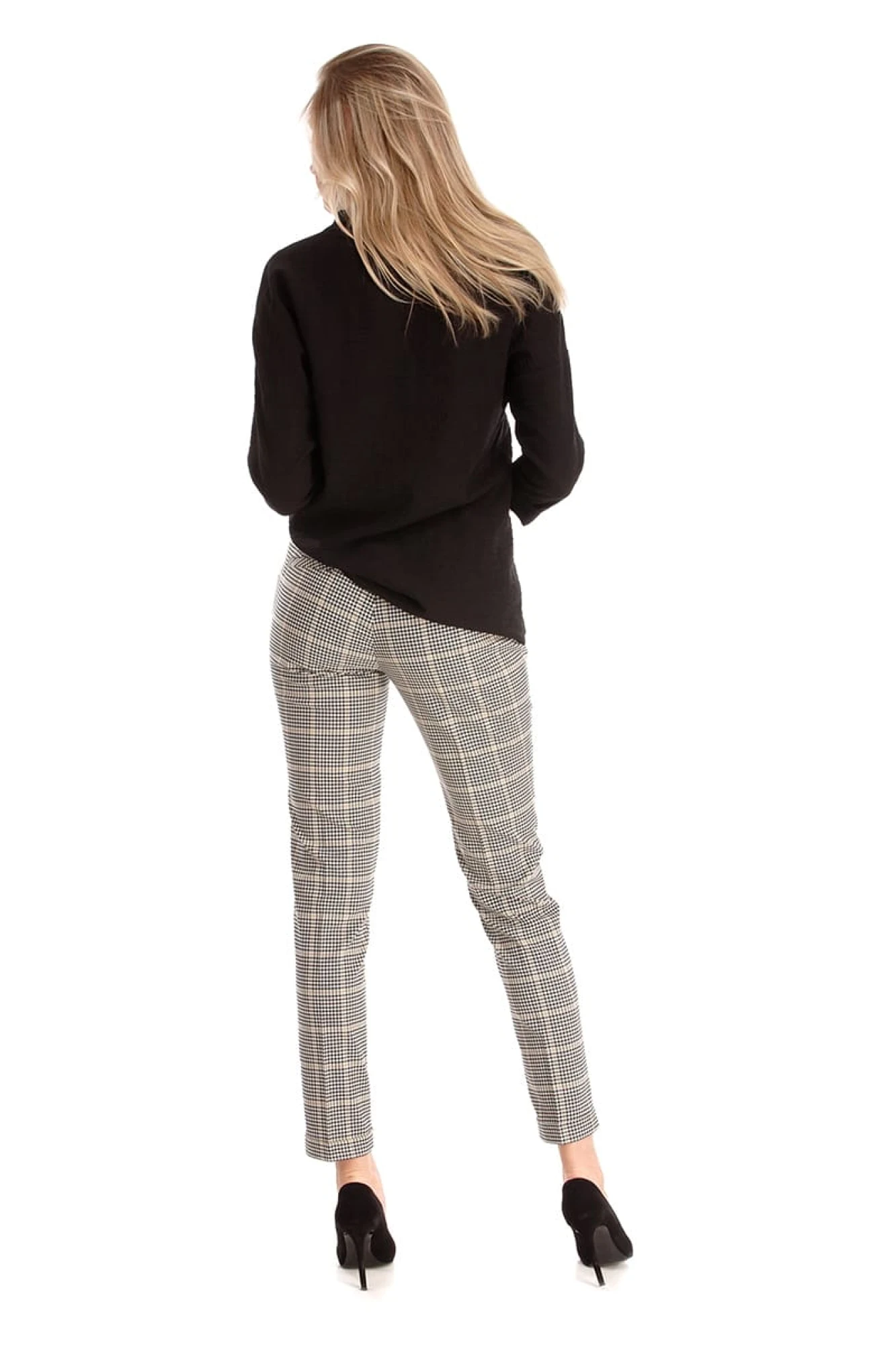 Брюки женские прилегающего силуэта, немного укороченные.Застежка на молнию и одну пуговицу.Перед со складками и боковыми карманами с отрезными бочками.Спинка с вытачками, также на спинке обработаны прорезные карманы-имитации с листочками.Низ изделия обработан цельнокроенными манжетами.Длина шагового шва 73 см. Бережная стирка при 30 градусах!
