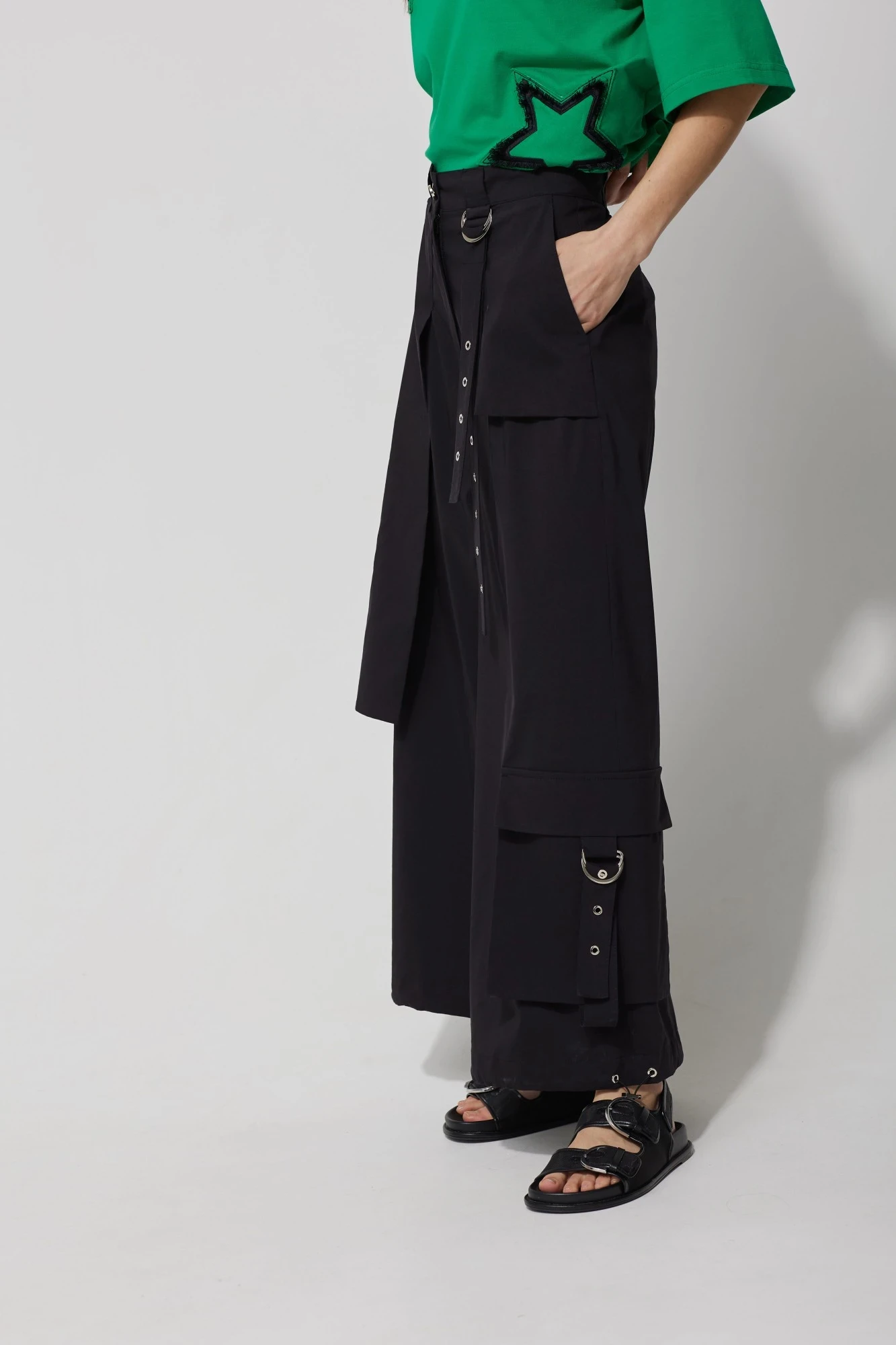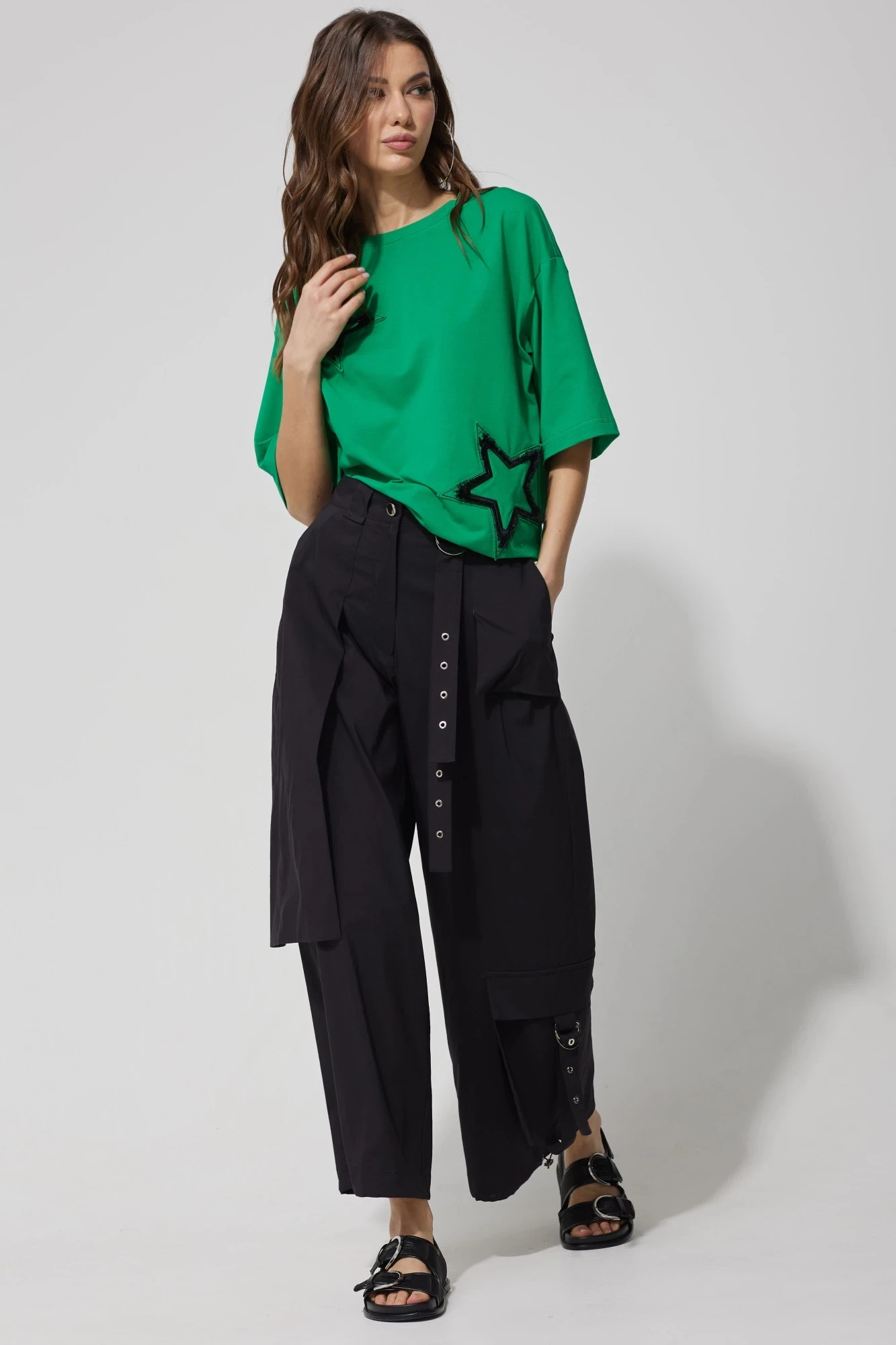 Укороченные брюки прямого силуэта из хлопковой ткани. По верху брюк притачной пояс с застежкой на петлю и пуговицу и шлевками для ремня. А спинке по поясу вставлена эластичная тесьма (резинка).По переду ассиметричные функциональные карманы и декоративный элемент на полукольцах. По низу декоративный карман с клапаном и декоративной патой на полукольца. На спинке вытачки. По низу брюк вставлен эластичный шнур с фиксаторами для формирования разной степени прилегания. Обращаем ваше внимание, что фурнитура может незначительно отличаться от фото.