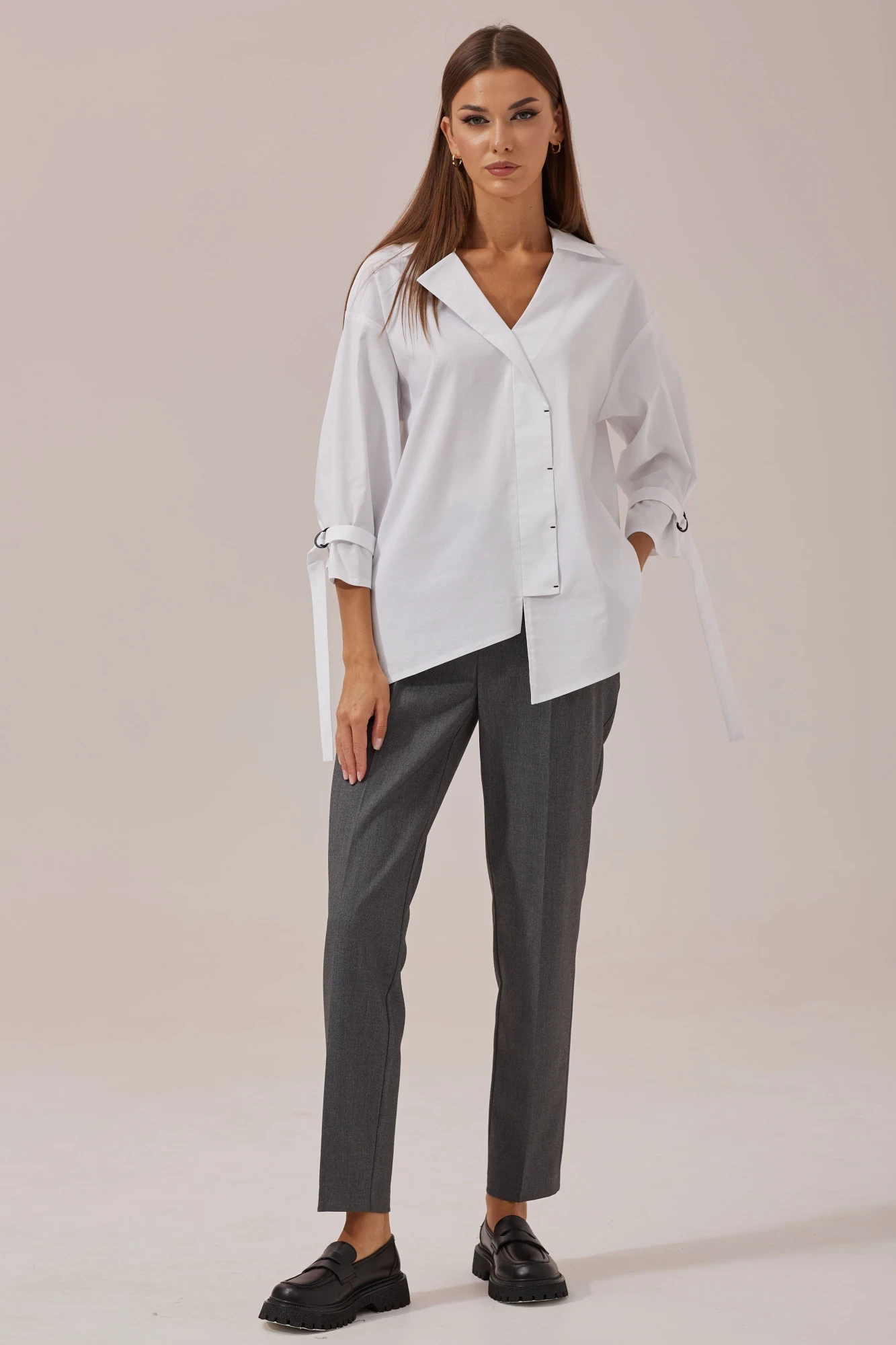 Брюки прямого силуэта зауженные книзу из костюмной ткани. По верху брюк притачной пояс с застежкой на петлю и пуговицу и шлевками для ремня. На передних половинках обработаны карманы и застежка молния в среднем шве. На задних половинках вытачки и декоративные листочки. Ремень в комплект не входит.