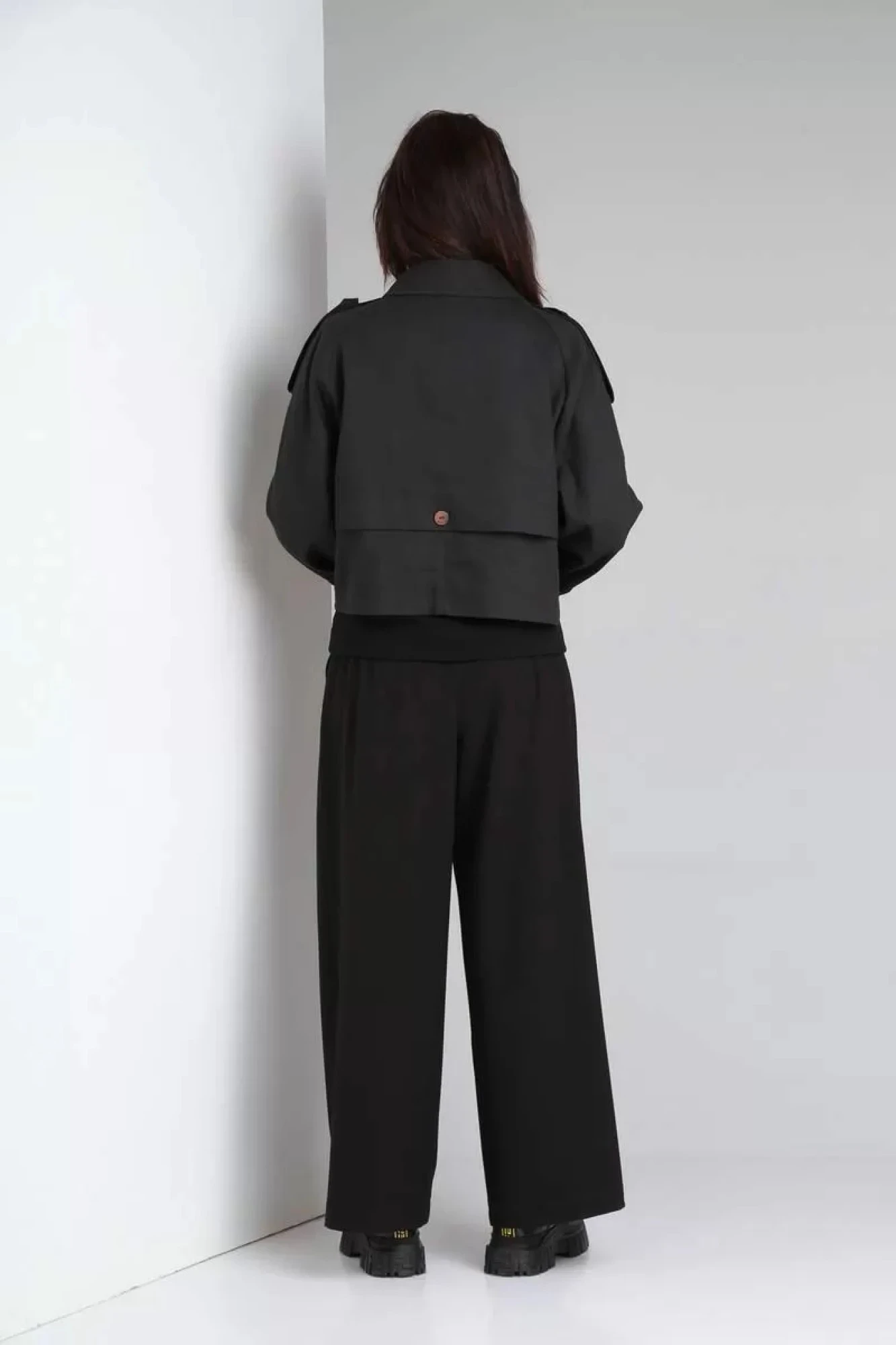 Брюки свободног кроя до щиколотки. В боковых швах обработаны карманы. По линии талии на передней половинке заложены глубокие складки. Пояс по спинке на резине