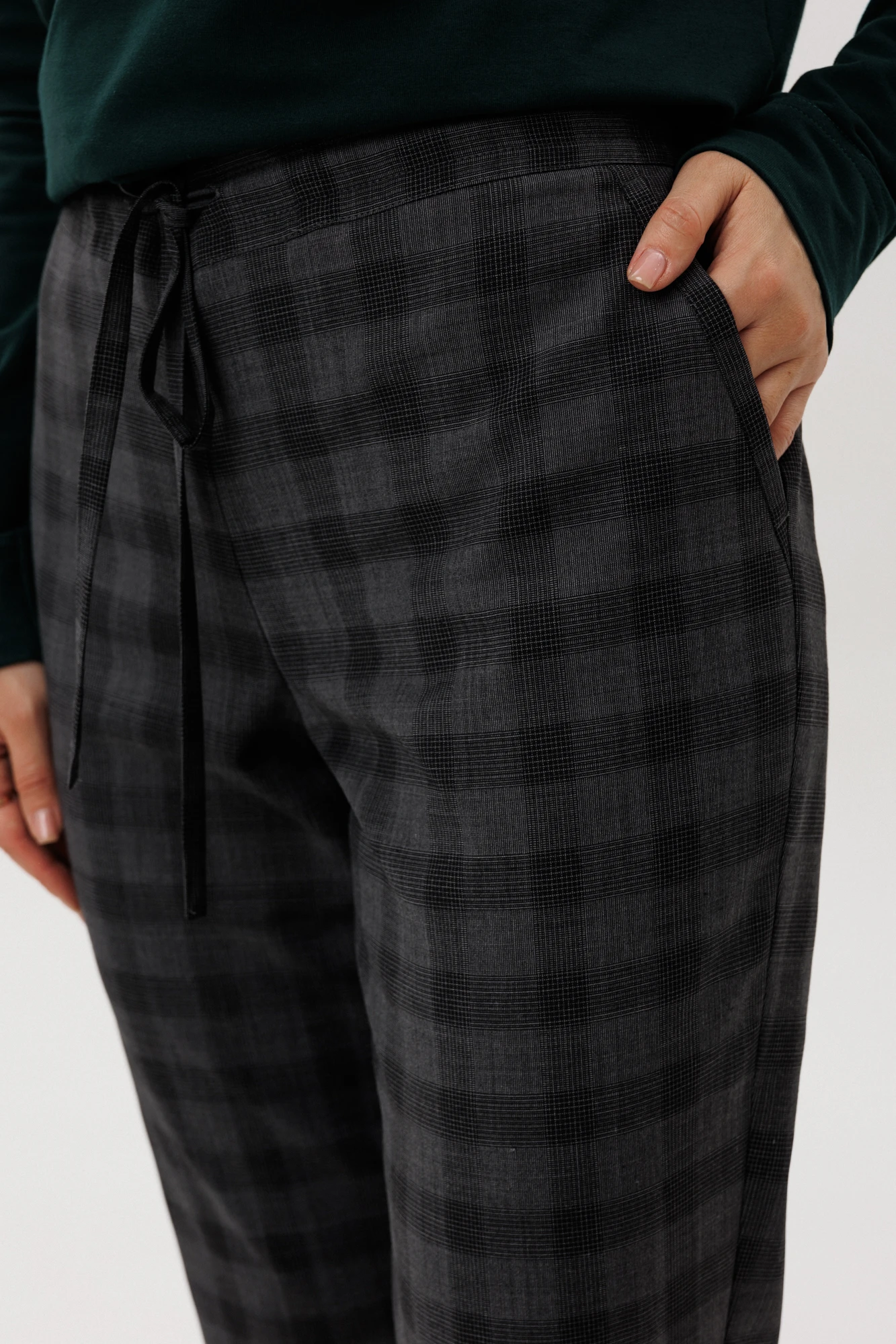 Брюки зауженые к низу без застежки. По боковым швам карманы. Линия талии регулируется по спинке резинкой.