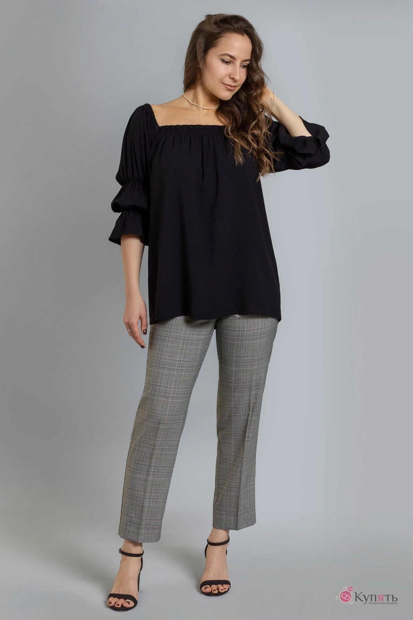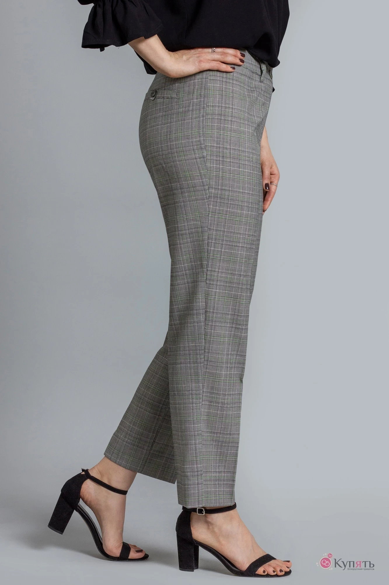 Классические брюки со стрелками 7/8 весеннего ассортимента прямые к низу. Брюки застёгиваются на молнию. В задней части пояса вставлена резинка.