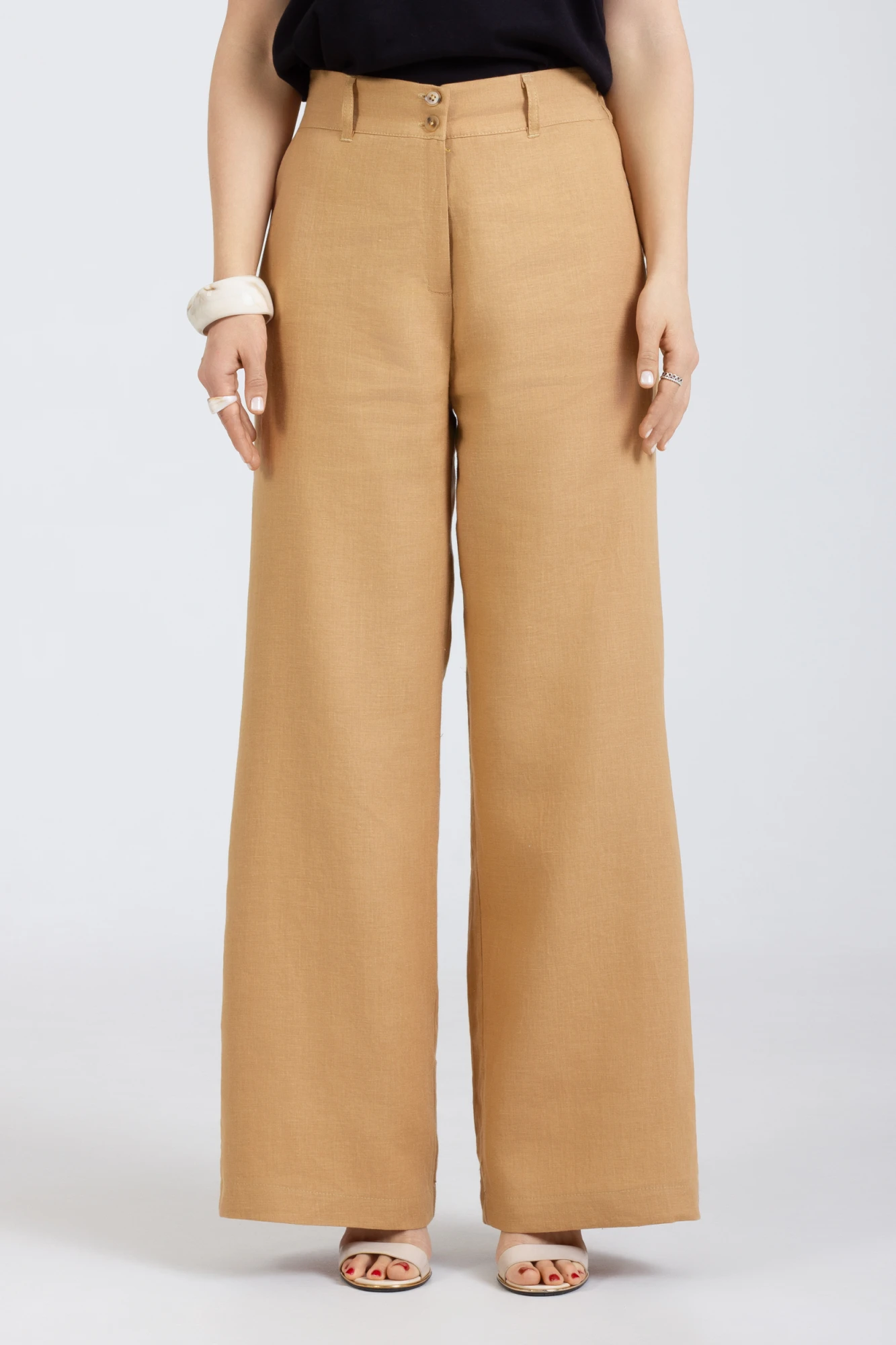 Брюки "палаццо" свободные от бедра изготовлены из натурального льна с "эффектом мятости". По переду внутренние карманы. Очень удобные. Застёгиваются спереди на молнию и 2 пуговицы. В задней части пояса вставлена резинка. Посадка: высокая .